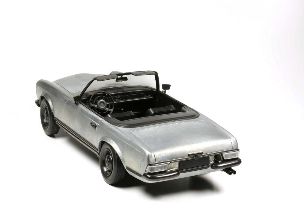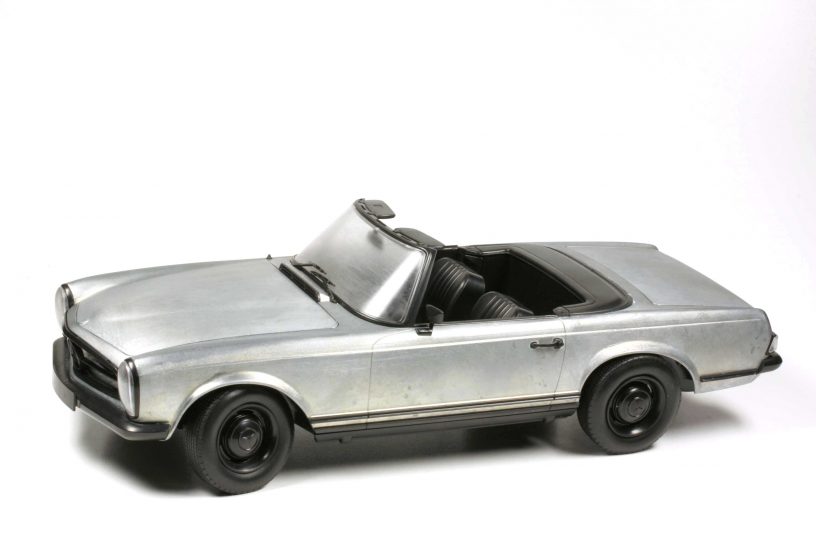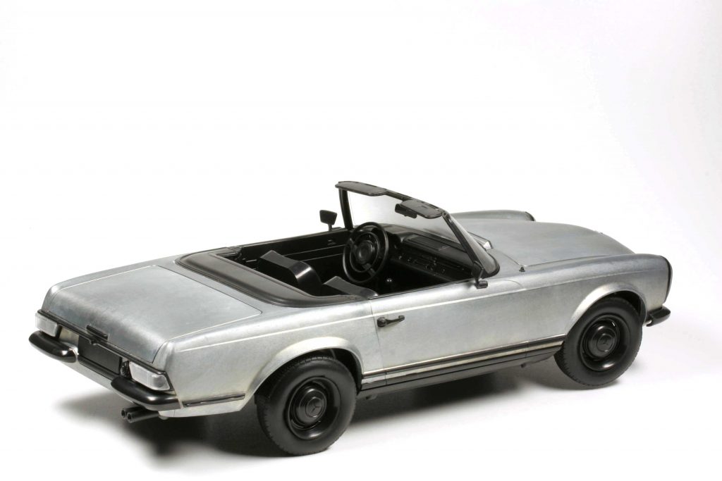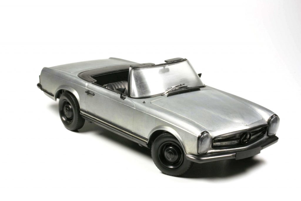 Der zweite Norev-Mercedes-SL in 1:12: Er belegt, dass die Marke bei Norev mittlerweile eine geschäftstragende Rolle spielt. Der erste ist der 300 SL Flügeltürer, eben erst erschienen, zunächst in Schwarz und Silber als Fachhandelsmodell, aktuell in Tiffanyblau und Panzergrau in limitierter Auflage für den Norev-Webshop. Nun die Pagode. Es ist nicht weit hergeholt, zu mutmaßen, dass danach der R107 folgen könnte. Oder ein 300 SL Roadster von 1957. Aber jetzt erst mal die Pagode. Roher als roh ist unser Muster, ein „first Shot“, nichts ist endgültig. Nichts? Doch, die generelle Machart und Form ist es schon, aber der Norev-Produktmanager Sascha Voss hat noch viel Arbeit im Detail vor sich. Die Form ist phantastisch getroffen. Das können wir jetzt schon sagen. Das wird eine schöne Pagode! Wie gewohnt bei Norev-Zwölfern, nichts zu öffnen, aber lenkbar. Man darf sich nicht von den einzeln eingesetzten Hauben irritieren lassen. Sie sind aus Werkzeuggründen separat, nicht um sie öffnen zu können. Beide große Mercedes SL sind in Eigenregie entstanden, Daimler-Benz steckt nicht als Auftraggeber dahinter.