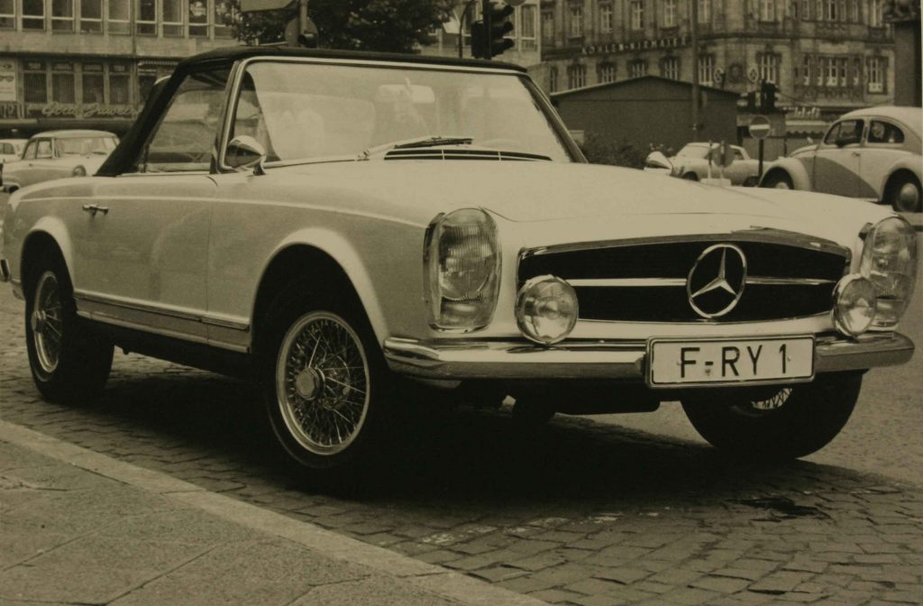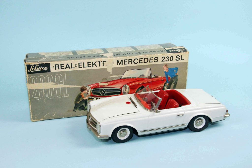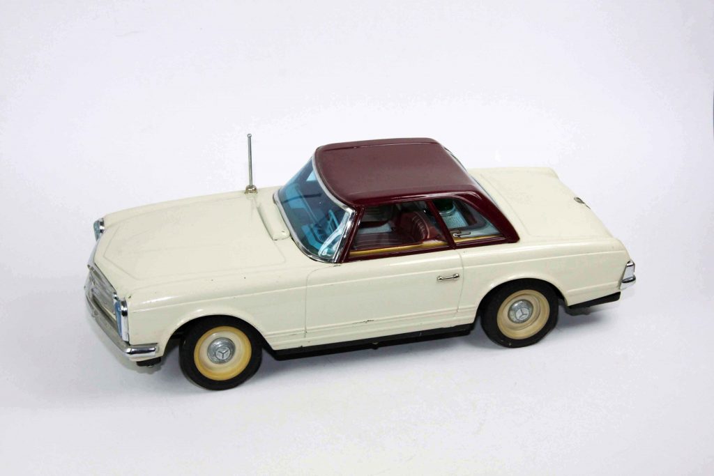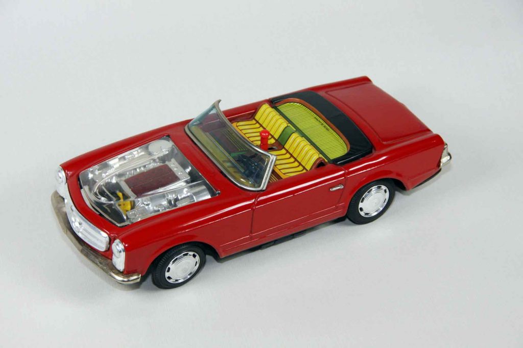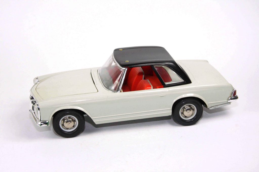 La Boum ist ein Kultstreifen und machte die damals 16jährige Sophie Marceau auf einen Schlag berühmt – und zum Schwarm der internationalen Teenager-Jungs. Ende 1980 erschienen, in deutschen Kinos ein Jahr später und im Fernsehen erst 1987, und der Titelsong Reality von Richard Sanderson wurde zur Hymne der Stehblues-Jünger. Damals gab es noch letzte Spielzeugautos. Und was deutlich größer als 1:43 war, hatte eine Plastikkarosserie und darunter Mechanik, Schwungradantrieb, Kabelfernlenkung, vielleicht schon RC-Technik. Es war nicht mehr die Zeit der Mercedes Pagode, der W107 war en vogue. Aber die Pagode gab es auch in groß, in sehr groß, mit Mechanik. Gama machte sie in Plastik, Rex auch, die Schuco-Pagode war aus Blech, ebenso wie die von Bandai und Masudaya (weil die Groß-Pagoden so schön sind, dürfen sie diesen Beitrag zusätzlich illustrieren). Und jetzt Norev, weit weg vom Spielzeug, aber auch in eins zu groß, nämlich als ausgewachsener Zwölfer. Caramini-online genießt das Privileg, dieses Vorhaben erstmals publizieren zu dürfen, ja, ein Vorserienexemplar in frühem Stadium (salopp „Rohling“ genannt) wurde uns anvertraut, und dieses Privileg teilen wir gerne mit unseren geneigten Lesern (mit den ungeneigten natürlich auch). Ein anderer aus der Branche würde in Versalien schreiben, die Info sei weltexklusiv. So dicke tragen wir nicht auf. Was besonders betont wird, klingt unglaubwürdig.