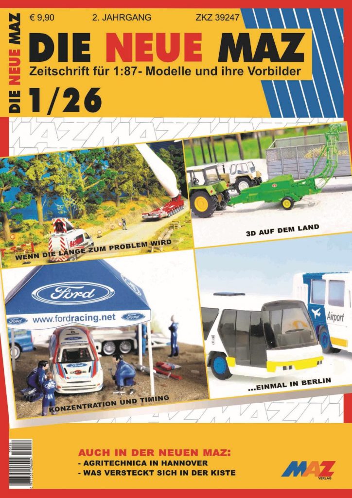 Seit diesem Jahr erscheint die Neue MAZ monatlich, ein sehr ambitioniertes Unterfangen. Denn Monat für Monat gilt es, das 48 Seiten umfassende Heft mit interessanten Inhalten zu füllen, die die Leserschar immer neugierig auf das nächste Heft machen sollen. Nachdem uns die ersten beiden Ausgaben für das Jahr 2026 vorliegen, haben wir keinen Zweifel am Erfolg der Neuen MAZ. Denn inhaltlich hat sie ihren Weg gefunden. Neben gestrafften Neuheitenvorstellungen zeigen Ekaterina Sergatschewa und Veit Kornberger das, was auch die Stärke der früheren Modellautozeitschrift war: Umbauberichte aus allen Bereichen, Dioramen, Berichte über Vorbild und Modell sowie vor allem Kleinserienmodelle. Für viele Modellautofreunde sind gerade die Kleinserienmodelle, ob aus Metall, Resine oder 3D-Druck, das Salz in der Suppe ihres Hobbys. Somit bietet die Neue MAZ nicht nur den reinen Modellautosammlern, sondern auch den fingerfertigen Umbauern reichlich Lesestoff und Anregungen.