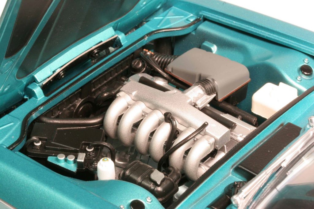 Dabei entsteht ein geschickter Mix aus hochwertigen Hinguckern und pragmatischer Vereinfachung. Das Ergebnis lässt einen großen BMW auf dem Tisch stehen, der seine Kompromisse erst zeigt, wenn der erste Gesamteindruck seine Wirkung getan hat. So sind die BMW-Plaketten an der C Säule sehr aufwendig ausgeführt und plastisch, während die Scheibenrahmen lediglich aufgedruckt sind. Die klassischen BMW-Leichtmetallfelgen sind sehr authentisch wie auch der nicht durchbrochen ausgeführte Frontgrill mit seinen Doppelscheinwerfern und der filigranen Chromumrandung von Grill und Niere. Das gleiche gilt für die gelungene Miniaturisierung der Heckleuchten. Die vorn angeschlagene Motorhaube verbirgt einen ausreichend detaillierten, mehrteilig ausgeführten Motor und seine Nebenaggregate, die mit einem Blick für die Gesamtwirkung sauber koloriert sind. Die Dichtlippe auf dem Schottblech zur Windschutzscheibe hin ist schwarz lackiert und auch die Dämmmatten auf der Innenseite der Motorhaube sind es.