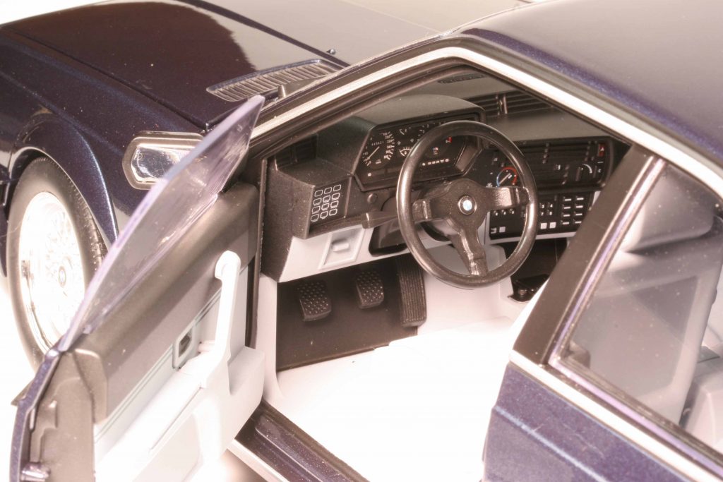 KK Scale ist weiterhin zielstrebig im Großmaßstab 1:12 unterwegs. Offenbar schreckt die schiere Größe der Modelle potentielle Interessenten nicht ab. Es überwiegt der Spaß an der Präsenz der großen Dimension und die Detailfreude, zumal im Gegensatz zu den 1.18ern desselben Herstellers immer der Motorraum zu öffnen ist, wie auch die Türen. Noch gibt es keinen Viertürer und so kennen wir die Vorgehensweise in diesem Falle nicht. Der 6er ist ein gut getroffenes Modell, er verbreitet Eleganz wie Sportlichkeit und beim Öffnen der Motorhaube wird gleich deutlich, hier sind wir beim dynamischen Kern der Geschichte. Diverse Schriftzüge und farbige Aggregate machen einen realitätsnahen Eindruck, auch die gern vernachlässigten Dämmflächen in der Motorhaube sind sauber nachgebildet. Im Interieur gibt es ein zweifarbiges Armaturenbrett und ein richtig platziertes Lenkrad. Die Sitze könnten weniger glänzen. Hier hat KK-Scale im Maßstab 1:18 schon echter wirkende Oberflächen realisiert.