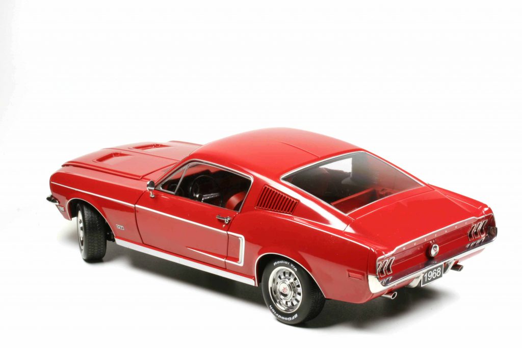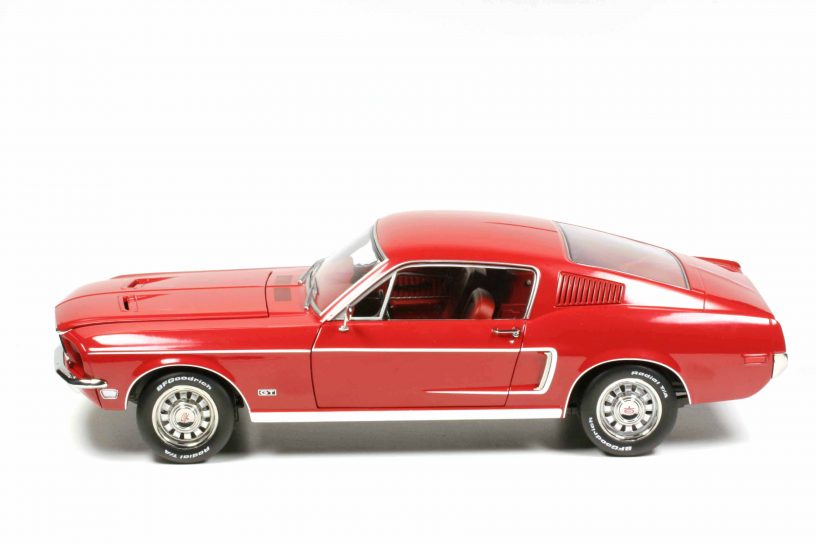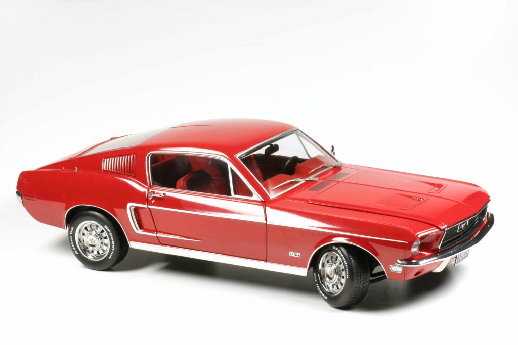 KK-Scale KKDC120222 Ford Mustang GT Fastback 1968 rot. Weitere Farben Blaumetallic, Schwarz und, wer hätte es gedacht, Bullittgrün. Fertigmodell Zinkdruckguss, Maßstab 1:12, UVP 199,95 €.