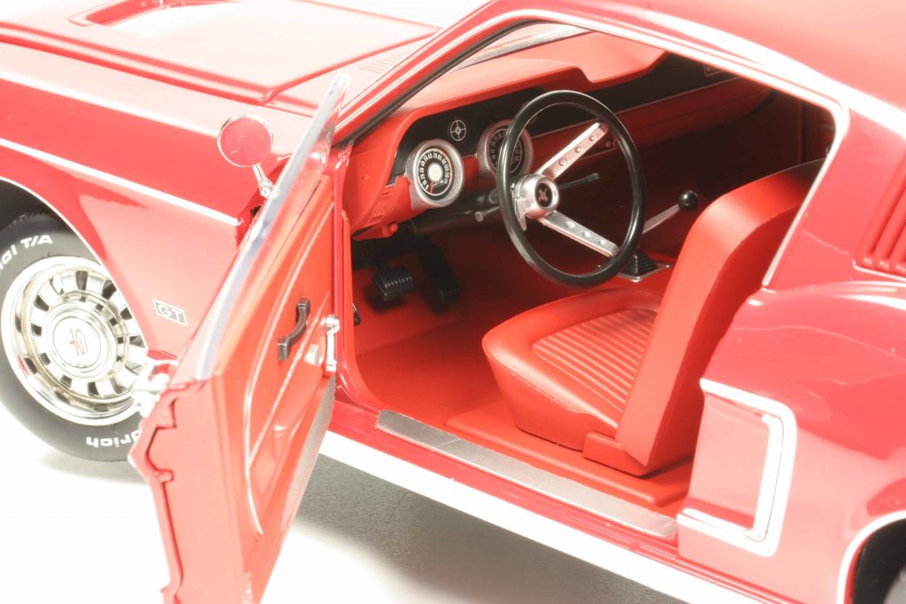 Nachdem wir vor kurzem den Mustang Fastback in der bekannt schlichten, leichtdüster entschlossen wirkenden und sehr dunkelgrünen Bullitt-Variante im Maßstab 1:18 vorgestellt haben, widmen wir uns heute seinem bürgerlicheren Bruder, baugleich in Karosserie und Fahrgestell, aber entspannter und weniger mit Verfolgungsjagden beschäftigt. Der dunkelgrüne Filmwagen musste aus cineastischen Gründen optisch zurückhalten, denn nicht er, sondern der Starschauspieler Steve McQueen war als Held des Films gedacht. Die Serienausführung hingegen darf in einem unferrarihaften, sehr himbeerigen Unirot daher kommen und bildet mehr das unbeschwerte Flair der amerikanischen Mittsechziger Jahre ab. Das tut sie gut, denn auch die übrigen Accessoires verfehlen ihre Wirkung nicht. Hellsilberne Stahlfelgen mit originalgetreu aufgebördelten Rechtecklöchern werden mit kleinen Chromradkappen und ebensolchen Radzierringen zu wahren Schmuckstücken ihrer Epoche und bleiben in ihrer Dimensionierung dennoch alltagstauglich.