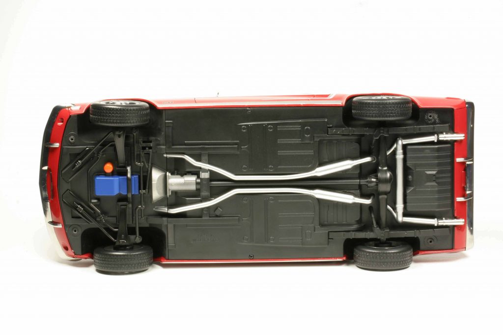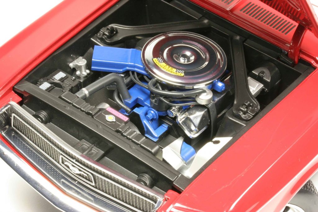 Die trifft KK-Scale nur bedingt, denn das große Modell im neuen Lieblingsmaßstab der Westfalen ist rundum sauber verarbeitet. Dass der Mustang auch im Original kein teures Hightech-Fahrzeug ist, wird im Modell am ehesten durch den pragmatischen Umgang mit der Teilevielfalt und der gelungenen Auswahl an realisierten Details in Verbindung mit dem Verzicht auf letzte Detailverliebtheit deutlich. Immerhin, wo andere Anbieter zwar wunderschöne, aber all closed Modelle präsentieren, gibt es bei KK-Scale immer zu öffnende Türen und einen Motorraum mit Farbe, Chrom und geschickt platzierten Winzigkeiten, die für einen angemessenen Grad an Authentizität sorgen. Auch werden die Modelle meistens in mehreren, deutlich unterschiedlichen Farb- und Dekovarianten angeboten. Dass viele Details, zum Beispiel am Unterboden, sich auf den zweiten Blick als Tampon lackierte Ausprägungen ein- und desselben Bauteiles herausstellen, nimmt der Betrachter mit einem Schmunzeln zur Kenntnis und wie beim Original bestimmt in diesem Fall der Wunsch nach großer Show für überschaubares Geld das Verhältnis von Aufwand und Wirkung. Insgesamt ist der Gesamteindruck harmonisch und stimmig. Ein Wunsch bleibt jedoch unerfüllt. Ein durchbrochener Kühlergrill wäre sich ja vielleicht noch ausgegangen.