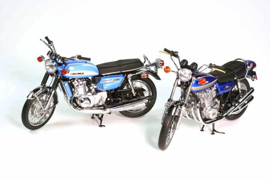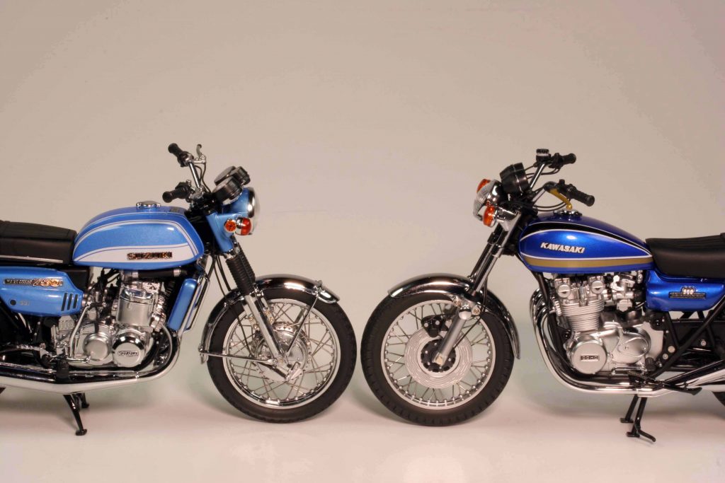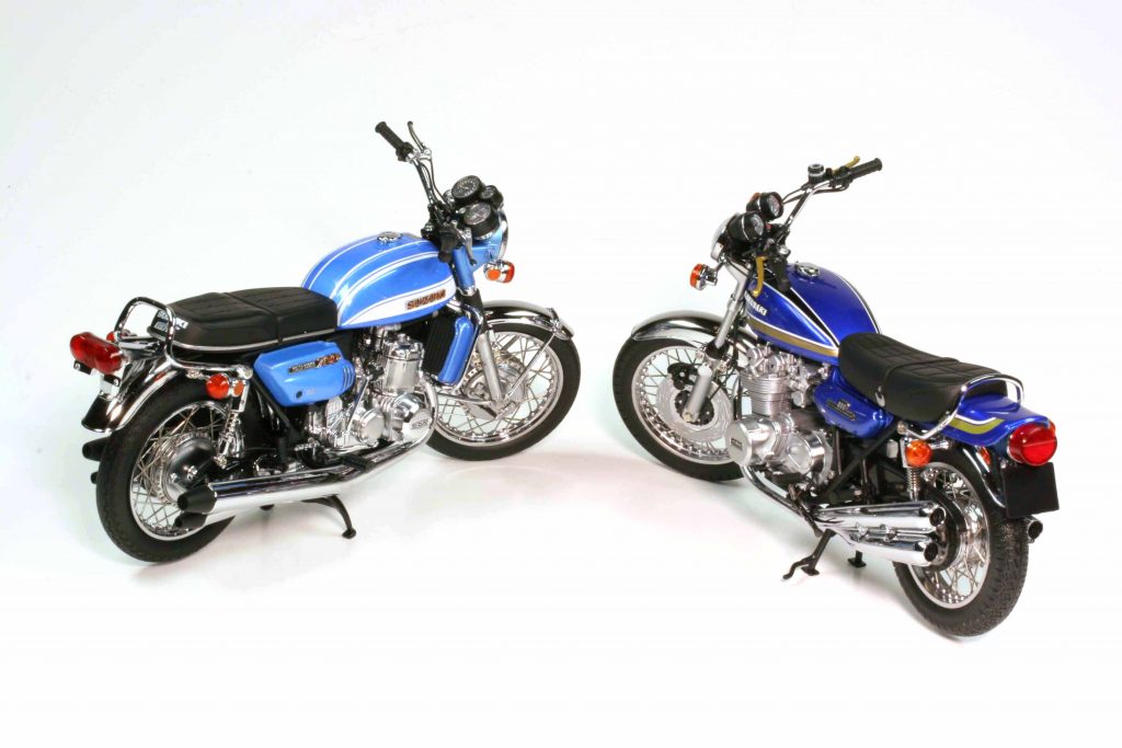 Minichamps 122162102 Suzuki GT 750 J 1972 blaumetallic und 122164102 Kawasaki 900 Z1 „Super 4“ 1972 blaumetallic. Fertigmodelle Zinkdruckguss/Kunststoff, Maßstab 1:12. UVP je 199,95 Euro.