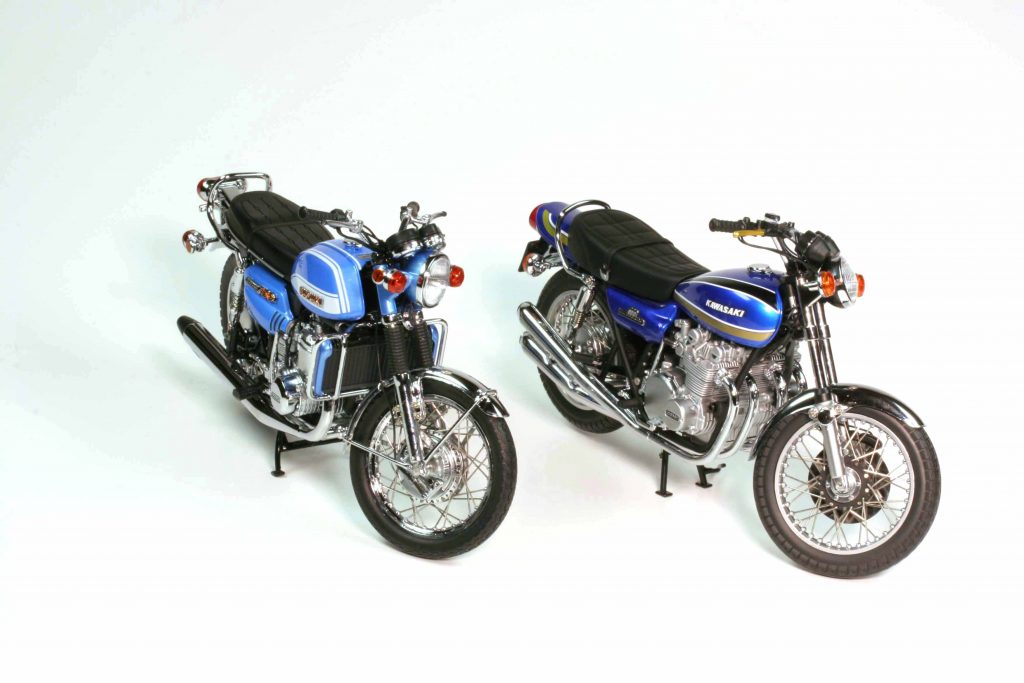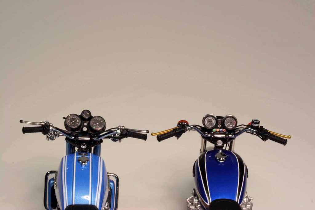 Das Minichamps-Suzuki-Modell hat Doppel-Duplex-Trommeln, also Modelljahr 1972 und Typbezeichnung GT750 J. Es gab das Original in zwei Farben, Candy Jackal Blue und Candy Levender (Rotmetallic), auf einigen Märkten zusätzlich Candy Yellow Ocher (Goldmetallic). Die Suzuki 750GT erschien bei Minichamps erstmals 2004 in Goldmetallic, 2009 folgte Rotmetallic, nun kommt die Wiederauflage in Blaumetallic (unser Fotomuster) und Grünmetallic, das beim Original erst 1973 erhältlich war. Als Minichamps-Modell jünger ist die Kawasaki Z1, erstmals 2008 am Markt gewesen, damals braun/orangefarben lackiert, im Folgejahr in Candy Green/Yellow, nun in Blaumetallic und Rotmetallic erneut erschienen und offenbar so begehrt, dass die Rote werksseitig bereits ausverkauft ist – bei den Fachhändlern sind aber noch genügend vorhanden.