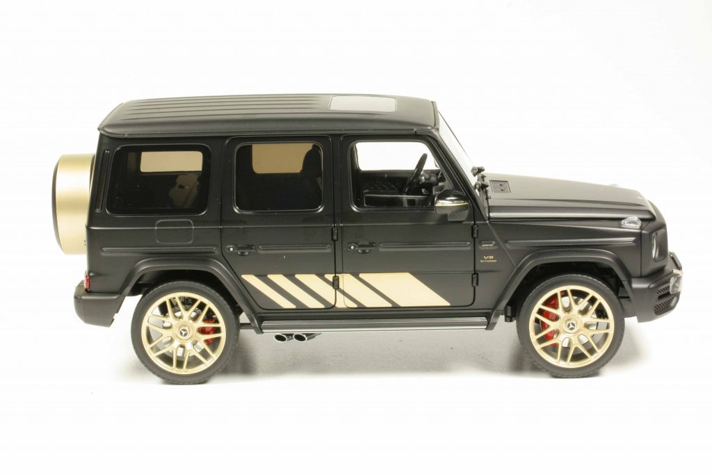 Almost Real hat eine wundervolle G-Klasse als Topmodell G63 AMG im Programm, ein 2015er Modell, also noch mit vorderer Starrachse, vor der großen 2018er Überarbeitung, als das Fahrwerk völlig geändert wurde (vordere Einzelradaufhängung) und der Wagen eine leicht größere Karosserie bekam. Jetzt kommt von Almost Real der Nachfolger, mithin die aktuelle G-Klasse, und den Opener dieser neuen Modellserie bilden zwei Sondermodelle, die „Cigarette Edition“ von 2020 und die „Grand Edition“ von 2023. Das sind, ganz grob gesprochen, die gleichen Modelle mit dem Unterschied, dass der „Cigarette Edition“ in glänzendem Obsidianschwarz lackiert ist und seine schwarzen Felgen mit knallgelben Felgenhörnern aufgewertet wurde, während der „Grand Edition“ mattschwarz lackiert ist (Designo Black Magno) mit silbernen Felgen. Beide tragen eine gelbe Flankendekoration, die Graphiken beim Mattschwarzen nach rechts, beim Glänzenden nach links gerichtet, und dieser hat auch noch einen Zusatzstreifen in Grau. Beide sind beim Almost-Real-Importeur Minichamps werksseitig vergriffen, aber sie sind bei den Händlern präsent. Wir haben uns das mattschwarze Modell ausgesucht, also die „Grand Edition“. Das wird nicht das letzte Sondermodelle auf Basis des aktuellen G 63 AMG sein, dessen sich Almost Real annimmt. Es wird auch die „Edition 55“ in Opalitweiß erscheinen. Angekündigt sind zudem weitere Farbvarianten, beginnend mit Irdium Silber.