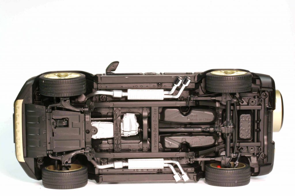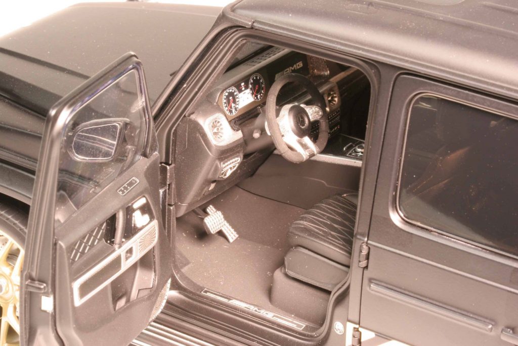 Almost Real macht seinem Namen wieder Ehre, wie in echt kommt das Modell daher. Zumindest von außen wie in echt, innen müssen Abstriche gemacht werden. Außen: mattschwarze Karosserie, in mattem Kalaharigold Magno gehalten sind der Stern, die Logos und das AMG-Wappen auf der Haube, auch die Einleger in den Stoßfängern, der vordere Unterfahrschutz und der Reserveradring. Techgold hingegen sind die Felgen sowie die Folierung an den Flanken, die Almost Real (natürlich!) als Drucke realisiert. Innen: Alles ist schwarz. Da entdecken wir überhaupt nichts Goldiges, dabei lebt der Innenraum dieser Version ja von dem Schwarz-Gold-Kontrast. Der Innenraum ist zwar wunderbar gemacht, aber völlig ohne güld’ne Kontrastnähte – weder an den Sitzen noch am Fußboden. Das ist schon schade und wir fragen uns nach dem Warum. Technisch machbar wäre das, zumindest auf den Sitzen, und Almost Real kann das. Über die golden eingefassten Fußmatten ließe sich ja noch debattieren. Gleichsam täte es dem Hersteller nicht weh, schlichtweg Fußmatten auf den Fußboden zu legen – wir sprechen hier ja nicht von einem Modell, das Spitz auf Knopf kalkuliert ist. Davon abgesehen, ist der Almost Real G63 AMG ein herrliches Modellauto, das alles kann, was es können sollte und muss, und das auf höchstem Niveau. Nur den Gimmick der beim Räderrollen mitdrehenden Kardanwelle hat diese G-Klasse-Generation nicht mehr. Das konnte hingegen das 2015er-Modell von Almost Real, und der G 4×4² mit Portalachsen konnte es auch. Es nützt niemandem. Aber es hilft dem Käufer, den Preis vor sich selbst zu rechtfertigen.