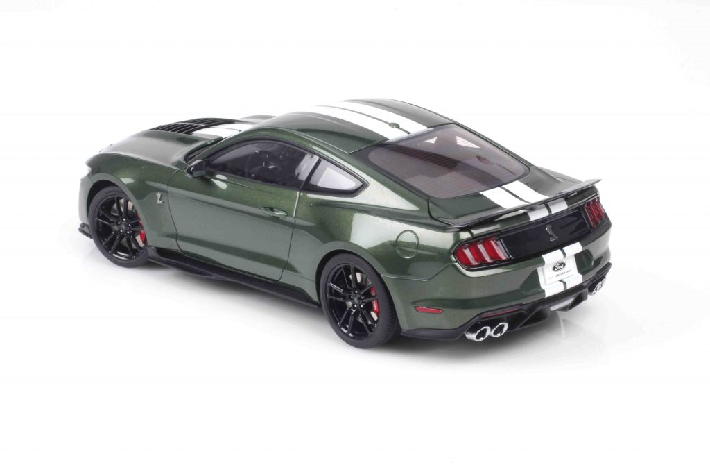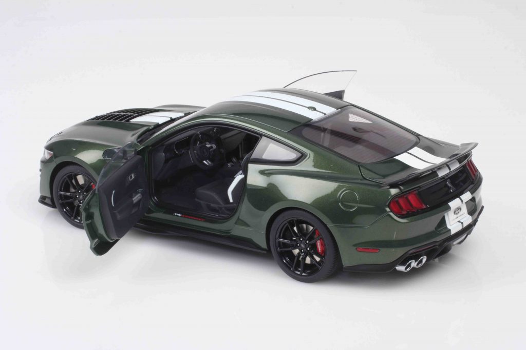 Wenn ein Modellauto in mehreren Farben erscheint, ist die eine Farbe eine Variante des Modells in anderer Farbe – ganz klar. Und doch kann es mehr sein als „nur“ eine Farbvariante. Denn Farbe ist bekanntlich mehr als nur Korrosionsschutz für eine Blechkarosserie. Sie ist Schmuck, sie ist identitätsstiftend, sie charakterisiert das Auto. Jüngst stellten wir den Ford Mustang Shelby GT500 von AUTOart als Formneuheit vor, und unser Fotomuster war in Grabber Blue lackiert (Caramini-online vom 29. Oktober 2025). Das ist eine von sechs Farben, in welchen AUTOart den Mustang ausliefert. Die anderen sind Oxford White, Rapid Red, Cyber Orange, Iconic Silber und Eruption Green. Nun sind Weiß, Rot, Orange und Silber eher gewöhnliche Farben für diesen Wagen, aber in Eruption Green Metallic verändert er sein Erscheinungsbild so sehr, dass wir in eine gewisse Begeisterung (so weit uns das persönlich möglich ist) verfallen sind und den Wagen in diesem dunklen Grün unseren Lesern nicht vorenthalten wollen – zumal Dunkelgrünmetallic auf dem Ford Mustang Fastback seit dem legendären Bullitt nun einmal eine ganz spezielle Bedeutung hat. Und überhaupt ist Dunkelgrün das englische Renngrün, symbolisiert Sportlichkeit, Performance, ist ebenso ikonisch wie traditionsbeladen. Deshalb, und also: Eruption Green Metallic.