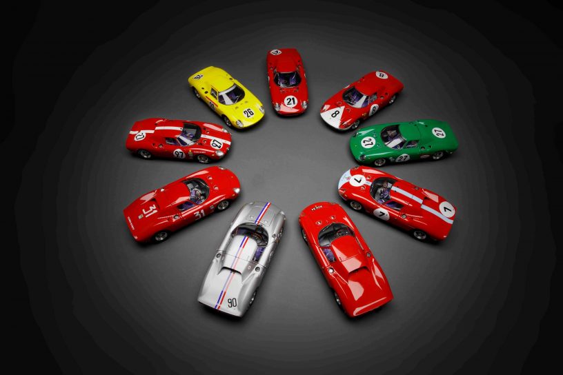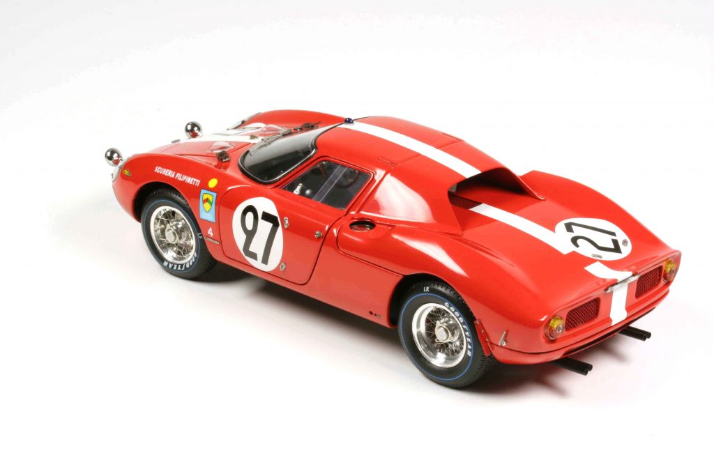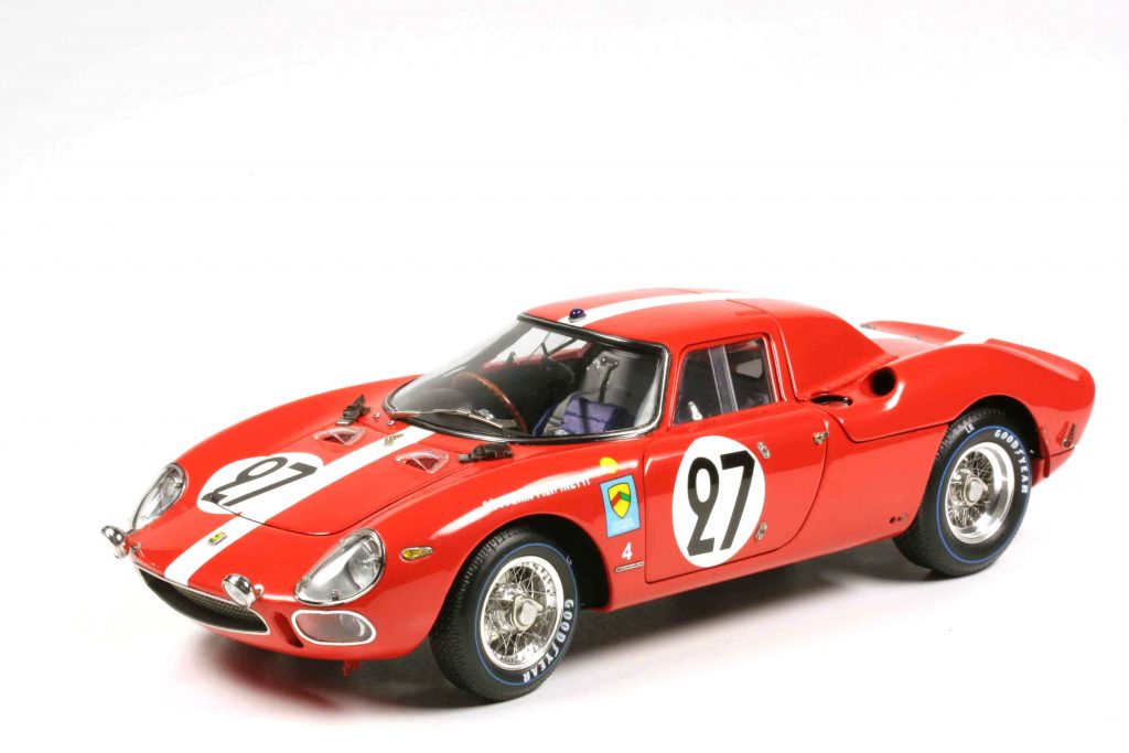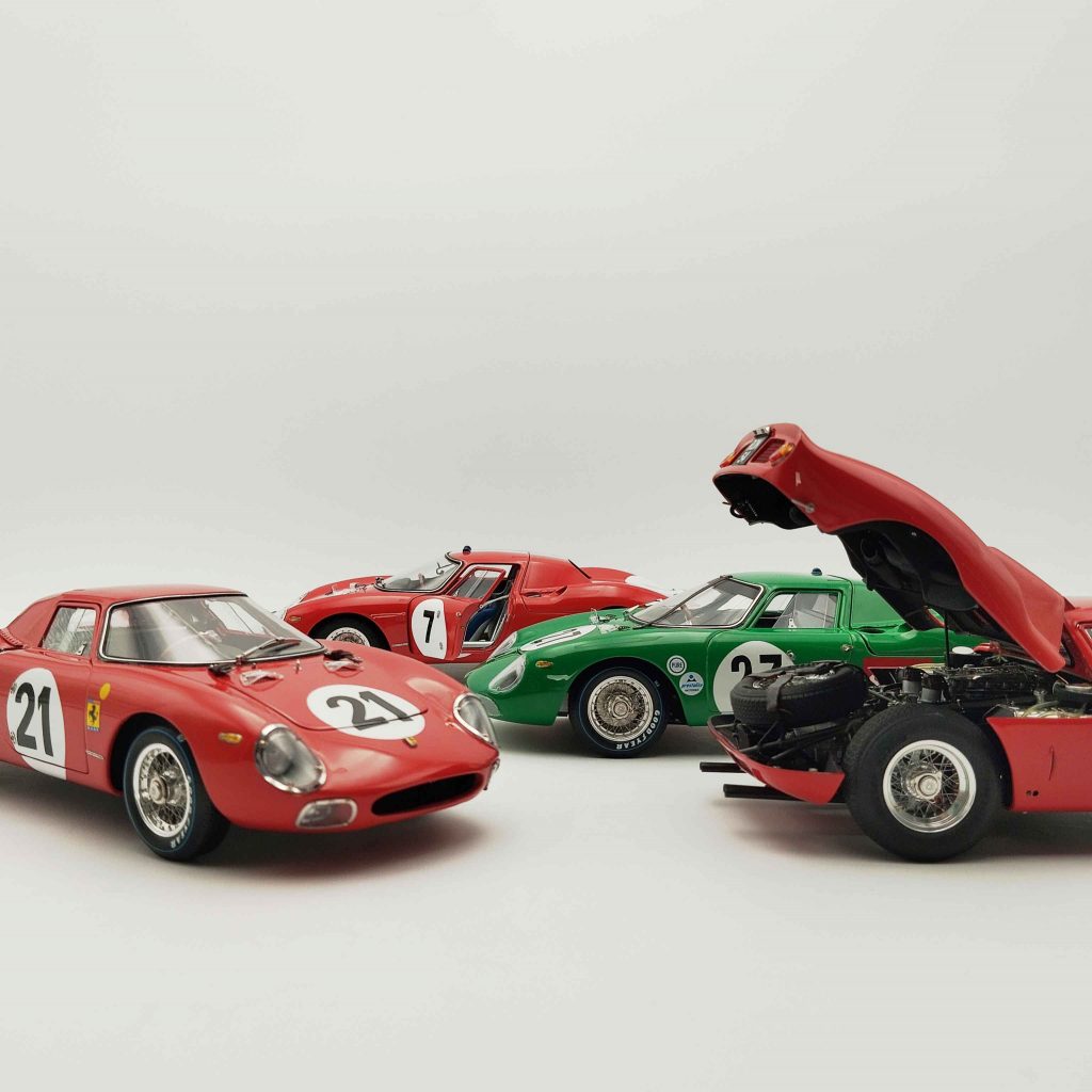 Neun unterschiedliche 250 LM bringt CMC, sieben davon mit identischer Grundkarosserie, zwei mit der sogenannten Drogo-Nase, also einer neu modellierten Frontpartie, was nur vier der 31 oder 32 (je nach Lesart) gebauten 250 LM zugute kam. M-261 ist der Sieger von Reims 1964, pilotiert von Graham Hill und Jo Bonnier (# 7), Chassis-Nr. 5895, seit den 80er Jahren Eigentum eines italienischen Sammlers. Ebenfalls in Reims 1964 eingesetzt war M-262, am Steuer John Surtees und Lorenzo Bandini (# 8), Chassis-Nr. 5909. Der Wagen war zunächst Bestandteil von Luigi Chinettis North American Racing Team (N.A.R.T.), dann gehörte es Bob Grossman von der Scuderia Bear, der es 1964 einsetzte. Unfall bei der Le Mans Classic 2008, dann Restaurierung. Dieser Ferrari ist ebenfalls Ferrari-Rot mit weißer Nase, wie M-261. Silbermetallic und somit außergewöhnlich für einen Ferrari lackiert ist der 250 LM von Ron Grossman (M-267), 1964 bei der Nassau Tourist Trophy eingesetzt, Chassis-Nummer 5909 (# 90). Le Mans 1965 gewann Chassis-Nr. 5893, Jochen Rindt/Masten Gregory (# 21), ebenfalls für das N.A.R.T. unterwegs, der vorläufig letzte Gesamtsieg für Ferrari in Le Mans. Dieser Wagen wurde 2025 in Paris für rund 35 Millionen Euro versteigert und er ist der eine, den sich CMC zum Vermessen auserkor. Das ist ein „Drogo“-Wagen, also mit der veränderten Frontpartie, CMC-Nr. M-263. Trotz 1500er-Auflage ist dieses Modell werksseitig ausverkauft, bevor es ausgeliefert wurde.
