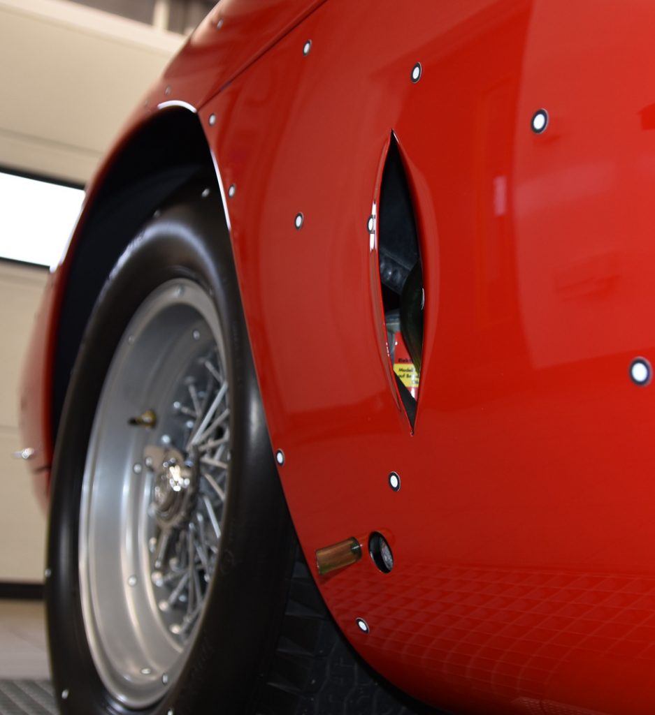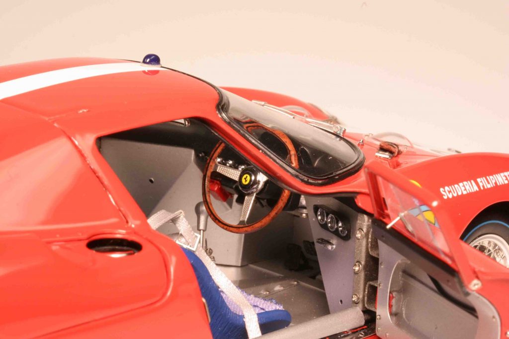 Nun ein verlängerter „Steckbrief“, sehr prosaisch und weitgehend schmucklos formuliert: Die CMC-Modelle bestehen aus jeweils rund 1800 Einzelteilen (je nach Variante). Zum Vergleich: Ein durchschnittliches, heutiges, „echtes“ Auto besteht aus rund 10.000 Einzelteilen, also gerade mal gut die fünffache Anzahl. Alle 250 LM von CMC sind Rechtslenker. Die Motorhaube klappt auf, hat zwei Abstützstangen, funktionierende Schnellverschlüsse, darunter auch ein Reserverad mit Lederbefestigungsgurten. Herzstück ist der voll verkabelte und mit Leitungen versehene V12 mit sämtlichen Anbauaggregaten. Die vordere Haube geht ebenfalls auf, ist (je nach Version) mit den CMC-typischen Lederriemchen verschlossen – die von den einen Sammlern vergöttert und von den anderen misstrauisch beäugt werden, weil nicht wurstfingergeeignet. Die Türen lassen sich öffnen und verfügen über funktionierende Schiebefenster. Der Innenraum ist absolut vorbildgetreu inklusive Anschnallgurten, die Ledersitze mit Textilbezug, vorbildliches Armaturenbrett mit allen Uhren und Schaltern. Die Borrani-Speichenfelgen sind perfekt gestaltet und bestechen durch schraubbare Zentralverschlüsse mit Rechts-/Linksgewinde. Ebenso exakt wie das Vitrinensichtbare ist die Unterseite: Bodengruppe mit hervorragenden Radaufhängungen, Öl- und Benzintank aus Edelstahlblech, auch Bodenplatten aus Edelstahlblech (abschraubbar), dazu Rennsportauspuffanlage und innen liegende Scheibenbremsen an der Hinterachse.
