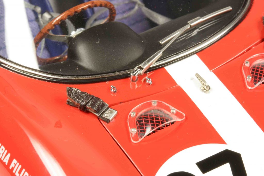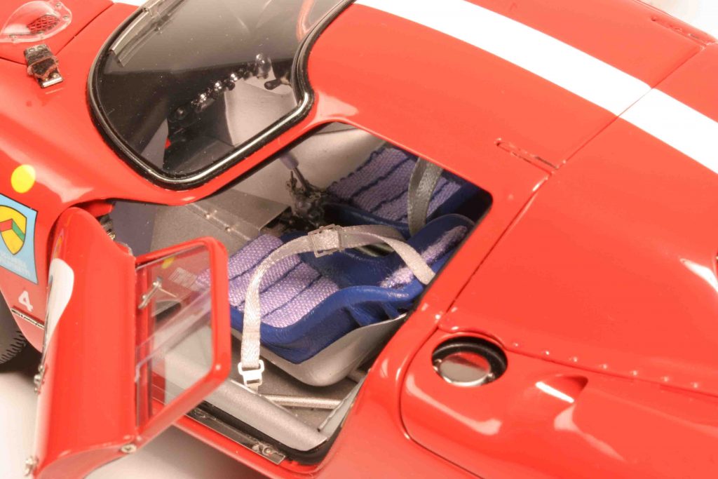 Das Modell ist das erwartete Labsal für die Sinne, vor allem für die Augen, ansatzweise auch für die Finger. Aber zu sehr befingern sollte man es nicht, es ist ein Ausbund an Filigranität. Die Lederriemchen zu öffnen, ist machbar. Sie zu schließen, ist trotz mitgelieferter Pinzette eine Herausforderung, der sich nicht jeder Eigentümer stellt. Das Wort des „Feuerwerks an Details“ ist furchtbar abgegriffen, profan, klischeehaft, wird von einem gewissen Anderen geliebt und inflationär verwendet – und ist eigentlich ein No-Go in Caramini-online. Wir fühlen uns dennoch zu dieser Bezeichnung bemüßigt – alleine, weil uns nichts Besseres einfällt. Es gäbe noch „Ausbund an Präzision“, „Kunsthandwerk in Vollendung“, „Meisterwerk der Modellbaukunst“ – alles längst bekannt und abgedroschen. Der Ferrari 250 Le Mans ist ein CMC-Modell. Das ist ein einfacher Subjekt-Prädikat-Objekt-Satz, aber er sagt alles aus und bedarf keiner Erläuterung.