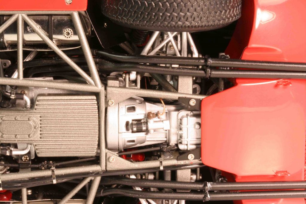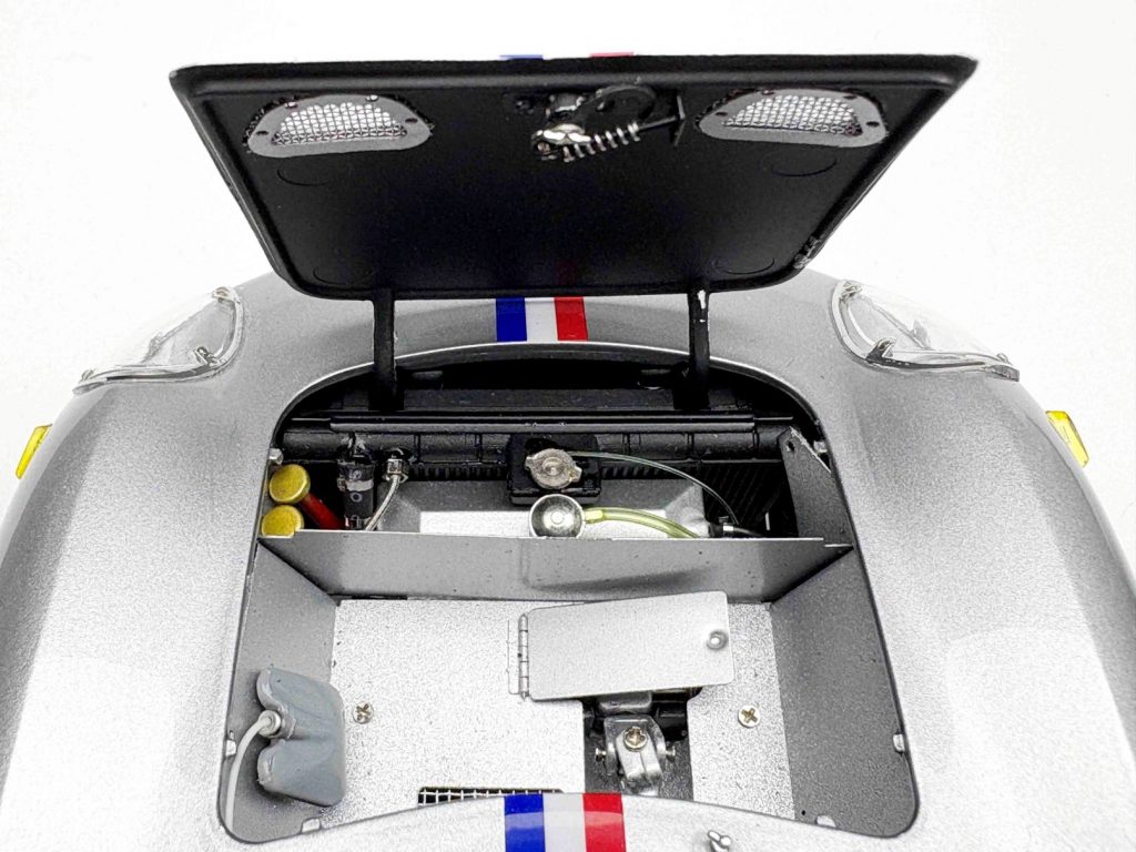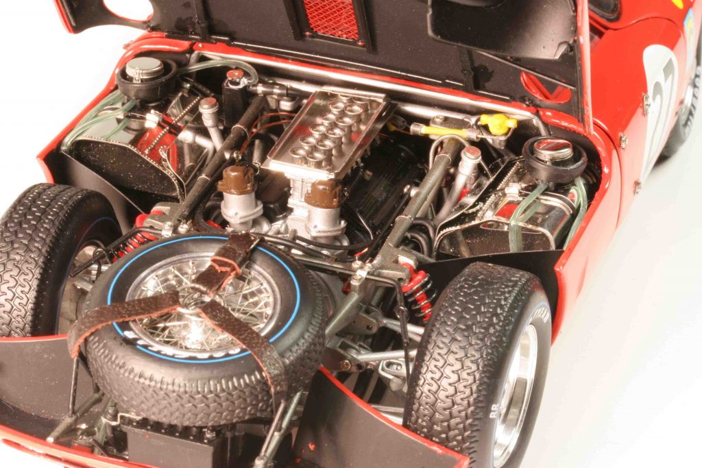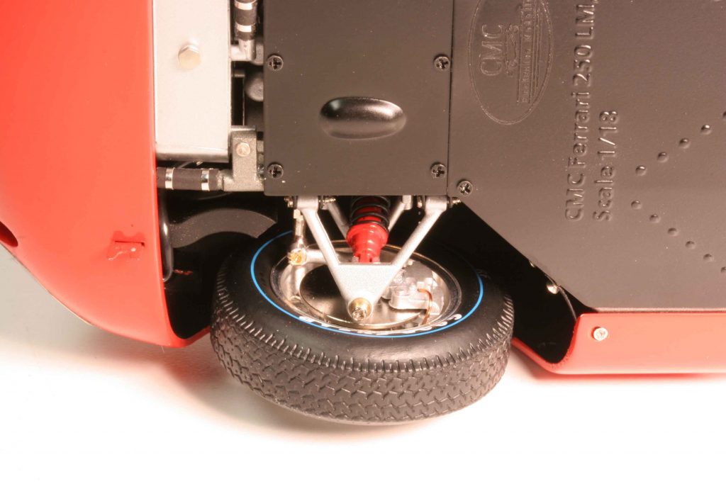 Und CMC wäre auch nicht CMC, wenn nicht die Einzelheiten der jeweiligen Fahrzeuge minutiös nachgebildet wären. Beispiel Reifen: Die meisten tragen Michelin-Pneus, drei haben Goodyear-Gummis. Der Unterschied? Er ist riesig! Denn die Goodyears gab es damals in einer High-Performance-Version namens Blue Streak (= blauer Streifen), und genau ein solcher war auf jedem Reifen aufvulkanisiert. Der Le-Mans-Sieger 1965, die Version mit der Drogo-Langnase und die # 21 trugen derartige Goodyear-Reifen mit blauen Streifen, die natürlich auch ein anderes Profil als die Michelins aufweisen. Deshalb: unterschiedliche Reifen an den CMC-Ferraris. Natürlich gibt es weitere unterschiedliche Details, je nach Version. Manche haben Lederriemen, Zusatzscheinwerfer und Mud Flaps an den hinteren Radhäusern. Und dann gibt es solch kleine Kleinigkeiten, auf die CMC selbst stolz ist und sein kann. So ist unter der Vorderhaube eine Klappe zu öffnen, worunter das Lenkgetriebe liegt, und dort konnten auch Schmierstoffe nachgefüllt werden. Oder unten, am Bauch, das kleine Schläuchlein, das der Tankentlüftung dient und durch ein Loch in der Karosserie vor dem rechten, hinteren Radlauf ins Freie geführt wird. CMC stellt es dar. Dann, auf dem Dach, entweder ein Blaulicht oder zwei Blaulichter oder kein Blaulicht: Von wegen Pace Car oder Streckenkommissar! Vielmehr diente es dazu, dass die Boxencrew bei Nachtrennen den Wagen rechtzeitig erkannte, wenn er in die Box einfuhr. Denn damals ging die Initiative, in die Box zu kommen, noch vom Fahrer aus, nicht von der Strategie am Laptop. Der Pilot hatte seine Benzinuhr im Blick und den Reifenverschleiß im Gefühl. Ebenfalls erwähnenswert: ein weiteres Schläuchlein, eine konstruktive Besonderheit eben dieses Wagens. Von unten mit Blick ins vordere, rechte Radhaus ist ein Schlauch zu sehen, der vom Kühler an den Rahmen geführt wird. Wer es nicht besser weiß, würde sagen: völliger Nonsense! Dem ist nicht so. Tatsächlich wurde Kühlwasser vom vorderen Kühler zum mittig/hinteren Motor nicht in einem eigenen Schlauch befördert, sondern durch die hohlen Rohre des Chassis’. Begründung damals: Das diene der Zuverlässigkeit, es gebe keine Schlauchplatzer. Vielleicht war das eine geniale Lösung, vielleicht aber auch Blödsinn. Jedenfalls wird jeder heutige Restaurator eines Ferrari 250 LM den Konstrukteur für diese Lösung verwünschen!