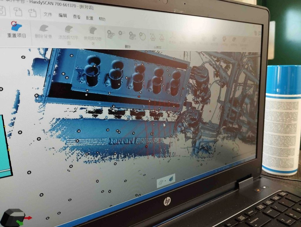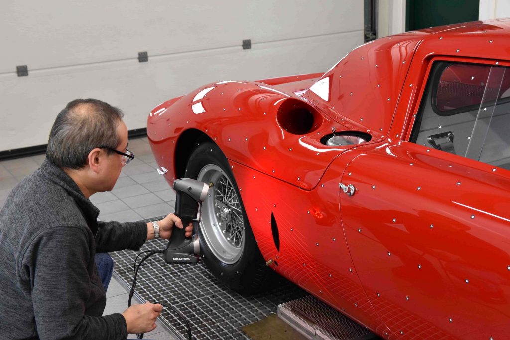 Das alles kennen wir von CMC, erwarten es auch. Deshalb ist CMC ja CMC und nicht Amalgam (deren Le-Mans-Siegerauto zumindest im Bereich der Drogo-Nase nicht stimmt). CMC betreibt den größtmöglichen Aufwand beim Abtasten des Originals. Zur Vermessung wird dieses mit hunderten oder gar tausenden lichtreflektierenden Punkten beklebt. Diese dienen dazu, dass die Scansoftware effektiv erkennt, wo im Raum respektive wo am Fahrzeug gerade elektronisch abgetastet wird. Jeweils drei bis fünf Punkte werden mit dem aufprojizierten roten Liniennetz „beschossen“. Dadurch können die beiden Optiken am Gerät aus unterschiedlichen Winkeln diese Punkte erkennen, und aufgrund ihrer Lage zueinander kann das System die erfassten Daten zuordnen. Dass die aufgeklebten Punkte, wie unser making-of-Foto zeigt, vermeintlich willkürlich angebracht sind, hat System: CMC-Deutschland-Chef Markus Mohn erläutert: „Hier wäre präzises Arbeiten ausnahmsweise kontraproduktiv. Denn wenn alle Punkte in demselben Raster und mit demselben Abstand zueinander angebracht würden, wäre das System orientierungslos.“ So baut sich also während des Abtastens der Karosserie oder eines Einzelteiles derselben oder des Motors oder eines sonstigen in sich geschlossenen Teiles während des Scans am angeschlossenen Computer peu-à-peu die Obenflächengeometrie auf. Natürlich ist das aufwendig und teuer – nicht nur wegen der Technik, sondern auch, weil man ein Original aufspüren muss, das gescannt werden darf, und etliche Mitarbeiter etliche Tage dort verbringen müssen, wo sich das auserkorene Fahrzeug aufhält. Aber von allem, was man selber macht, weiß man, wie man es gemacht hat und was es taugt. Andere Modellautohersteller (längst nicht alle, Gott bewahre!) kaufen Daten und wissen nicht, unter welchen Bedingungen und in welcher Qualität sie angefertigt wurden. Und die ganz Dreisten scannen ganz einfach ein vorhandenes Modellauto ab, das sie dann größengleich bringen oder hoch- oder herunterzirkeln. Ganz elend ist das Ergebnis, wenn eine 1:43-Miniatur in 1:18 hochkopiert wird. Alles schon dagewesen…!