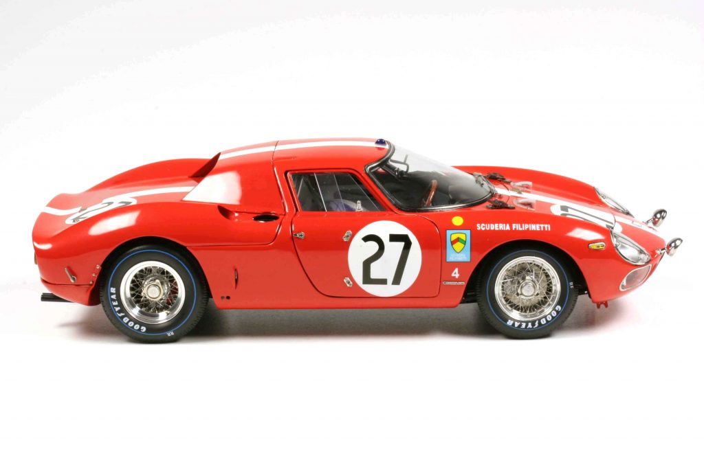 Seinen ersten öffentlichen Auftritt hatte Chassis-Nummer 6105 auf der Earls Court Motor Show 1964 in London und diente Corgi Toys als Vorbild für seine zeitgenössische Miniatur (M-266). Danach kaufte ihn der Gentleman-Driver Ron Fry. Er und seine Nachfolger setzten den Wagen bei lokalen Berg- und Sprintrennen bis 1970 ein, dann wurde er nach Japan verkauft. Heute ist er wieder in Europa, und dieser Wagen mit dem Kennzeichen RON 54 ist der zweite, den CMC gescannt und fotografiert hat (und dann noch einen dritten mit Serienkarosserie). Dies ist das einzige Modell ohne Startnummer, einfach ein rot lackierter Ferrari als Straßenfahrzeug mit Straßenzulassung. Für manchen Sammler mag dieses „Defizit“ gerade ihn zum begehrtesten der Reihe machen. M-268 ist der Monza-Gewinner 1964, Nino Vaccarella (# 31). Chassis-Nummer 5899 ging ursprünglich auch an die Scuderia Filipinetti in die Schweiz. 1965 schwerer Unfall. Dies ist der Wagen, der dann mit einer Porsche-906-Karosserie neu aufgebaut wurde, verunfallte unter wechselnden Eigentümern erneut mehrmals und wurde erst Ende der 90er Jahre vernünftig restauriert und in Folge 2005 von Ferrari Classiche zertifiziert. Last but not least M-278, ein weiterer Drogo-Longnose-Ferrari, Chassis-Nummer 5897, David Piper/Richard Attwood auf Rang 15 bei den 24 Stunden von Daytona 1966 (# 27). Die Lackierung ist in typischem Piper-Grün gehalten, nur für mutige Ferrari-Sammler geeignet (passt aber hervorragend zum Piper-GTO, den Caramini-online am 28. Mai 2024 präsentierte). David Piper war Erstbesitzer ab Juli 1964, nach Unfall im folgenden September mit fabrikneuem Chassis neu aufgebaut. Der Wagen hatte wechselnde Eigentümer und mehrere Unfälle und wohnt heute in der Schweiz.