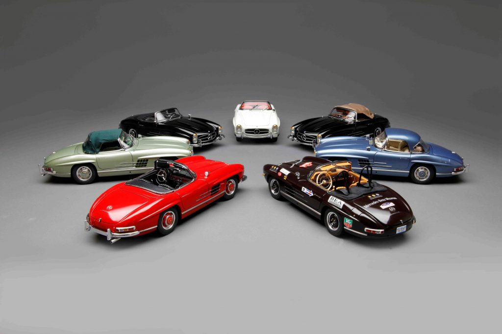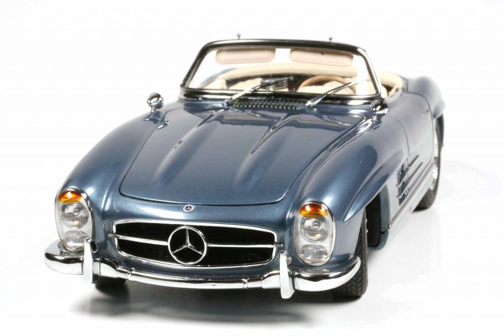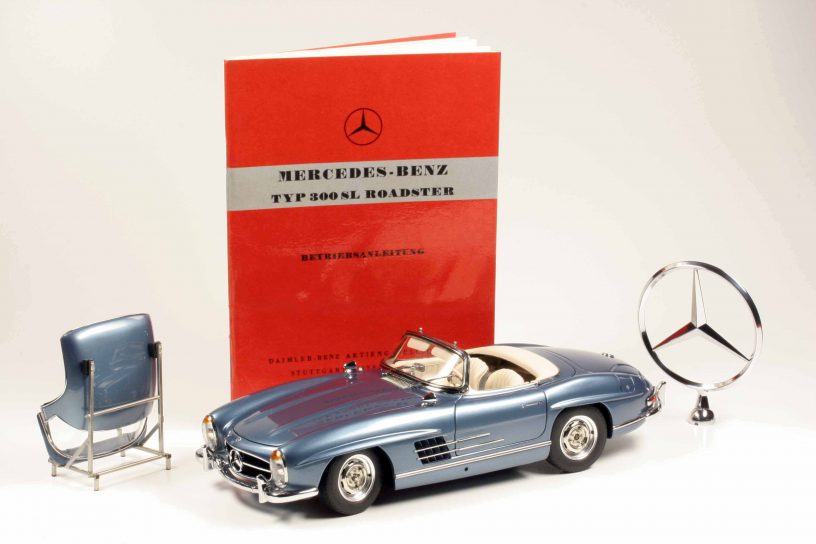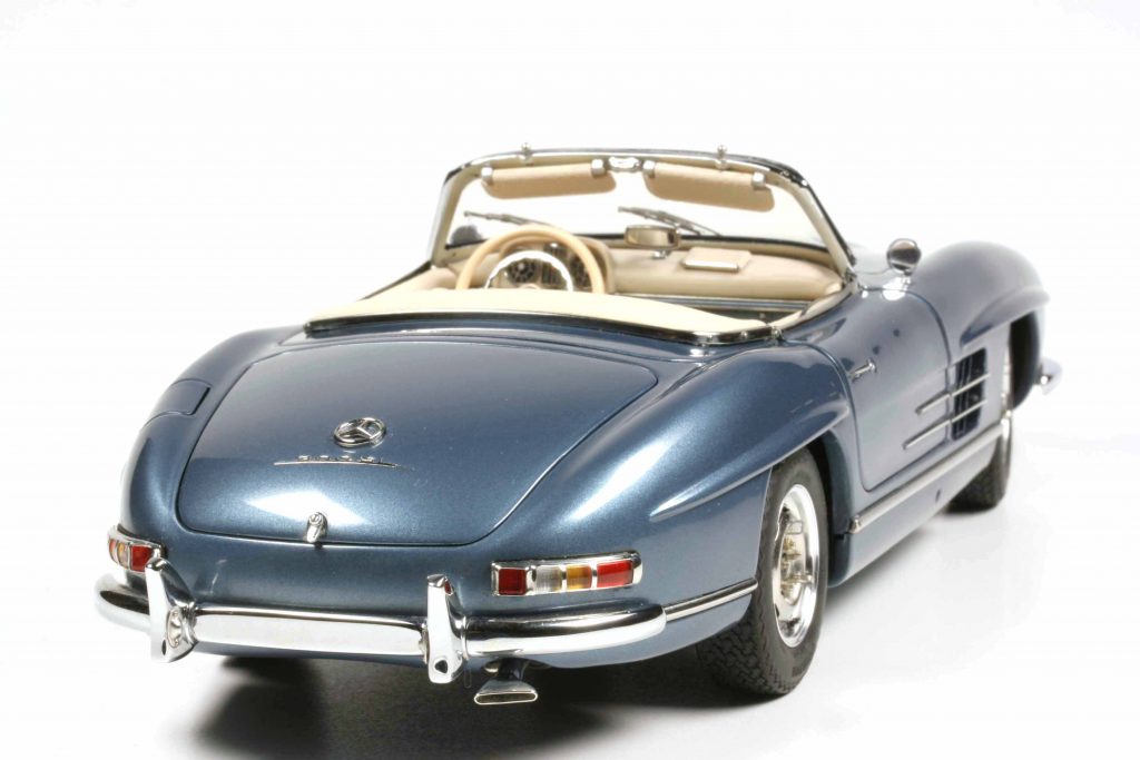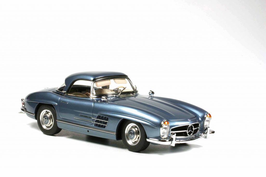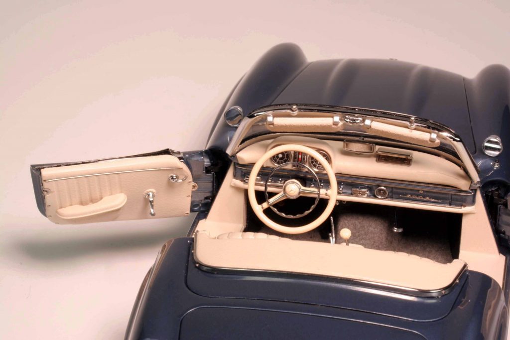Die beiden offenen Roadster in Schwarz und Rot haben als Besonderheit, dass die Seitenscheiben mit der Handkurbel hinauf- und hinabgekurbelt werden können. Bei beiden Hardtopmodellen (Hellblaumetallic und Weiß) ist selbiges abnehmbar und kann auf einem mitgelieferten Ständer deponiert werden (muss vom Kunden montiert werden, ist aber kein Hexenwerk). Die Modelle mit Stoffverdeck bestechen wie erwähnt durch ein funktionales Verdeck. Es gibt also keinen „Döner-mit-allem“-SL, jeder hat seine Besonderheiten. Das sei wichtig für die Allessammler, betont CMC-Geschäftsführer Markus Mohn. Durch diese Politik der selektiven Fähigkeiten hätten sie einen guten Grund, wirklich jede Variante zu erwerben. Die Preise variieren ein wenig, je nach dem, wie aufwendig die Modelle sind, und rangieren zwischen 676 und 724 Euro.