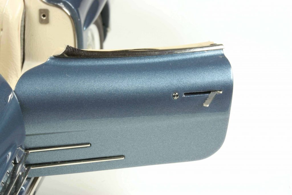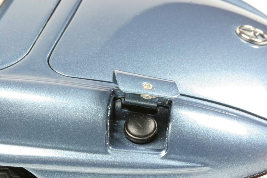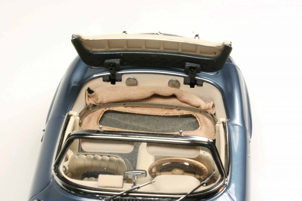 Wir haben uns als Muster die hellblaumetallicfarbene Hardtop-Variante ausgesucht. Warum? Zum einen, weil man eine funktionale Fensterkurbel nicht in einem unbewegten Bild darstellen kann. Zum anderen, weil das auch für das funktionale Stoffverdeck gilt und wir überdies einen Heidenrespekt vor der Friemelei haben. Die Hardtop-Variante ist für unbewegte Bilder geeignet: Hardtop montiert oder unmontiert, statt seiner der Verdeckkastendeckel, obendrein der Hardtopständer – lässt sich alles fotografieren. Der Verdeckkastendeckel ist ziemlich versteckt verpackt, eingelassen in die Unterseite des Styropordeckels der Umverpackung. Aber wer sucht, der findet… Wer seinen Ess-Ell offen in die Vitrine stellen möchte, empfindet das senkrecht auf dem Ständer stehende Blechdach als sehr hübsche Dekoration neben dem Modell. Das Hardtop wird abgenommen, indem man es nach hinten klappt und aus den Scharnieren löst. Genau so wird der Verdeckkastendeckel eingehängt, der somit klappbar ist und den Bereich hinter den Sitzen offenbart, natürlich alles mit weichen Stoffen verkleidet, kein Plastik. Die Sitzlehnen sind vorklappbar, an der Rückseite Luftlöcher.