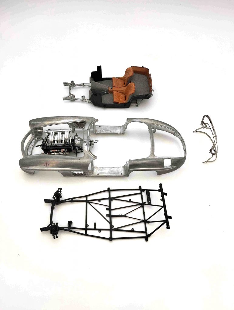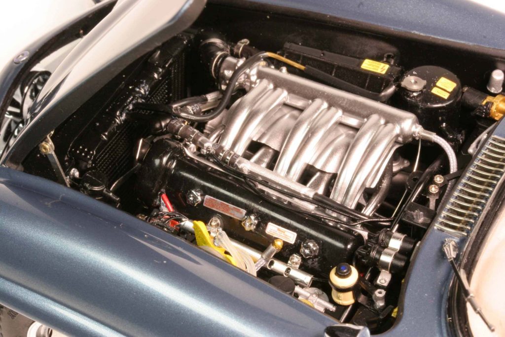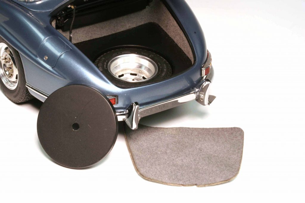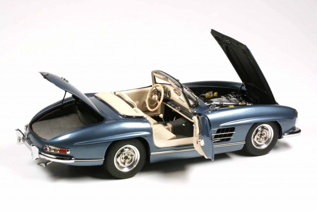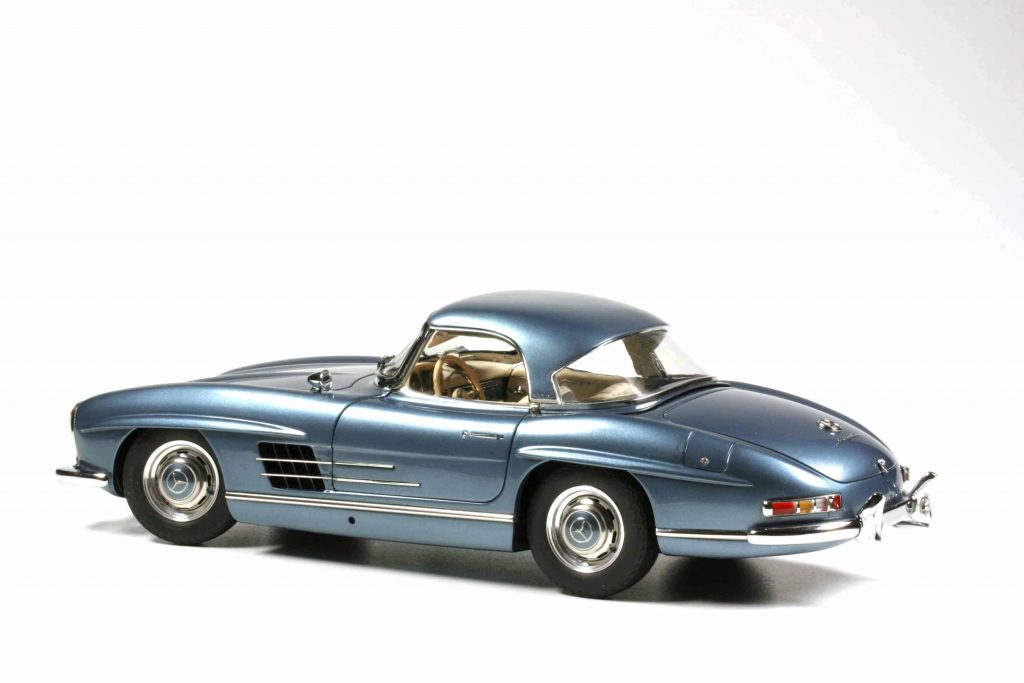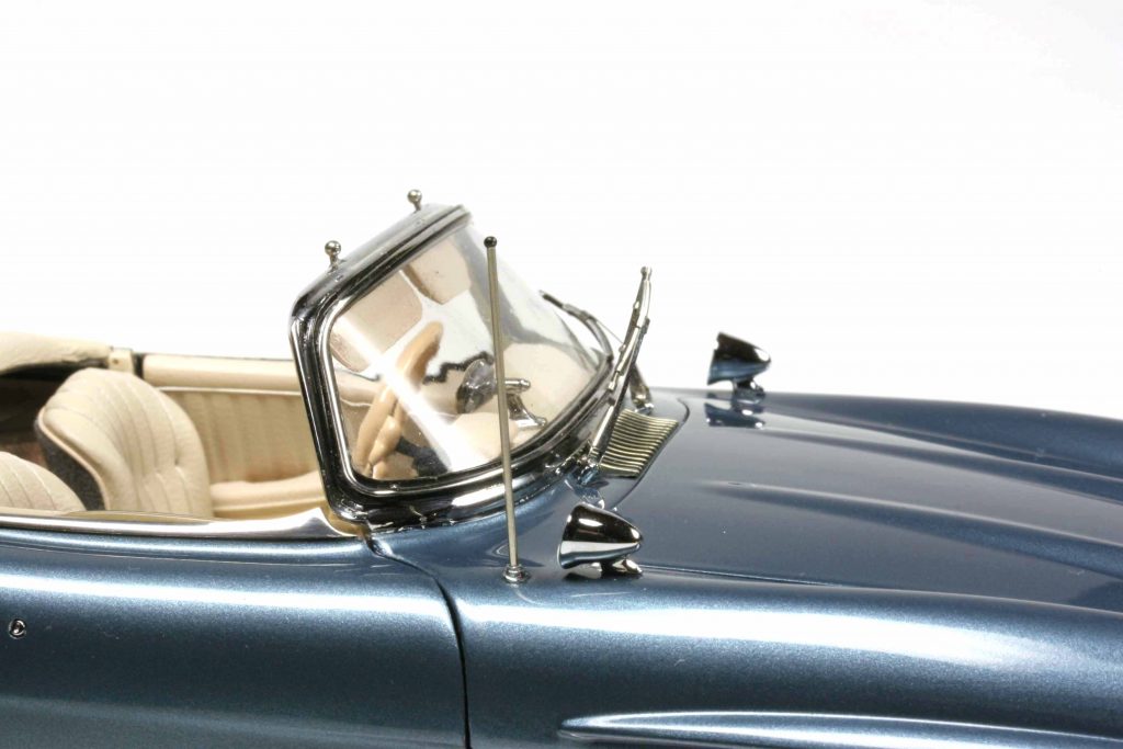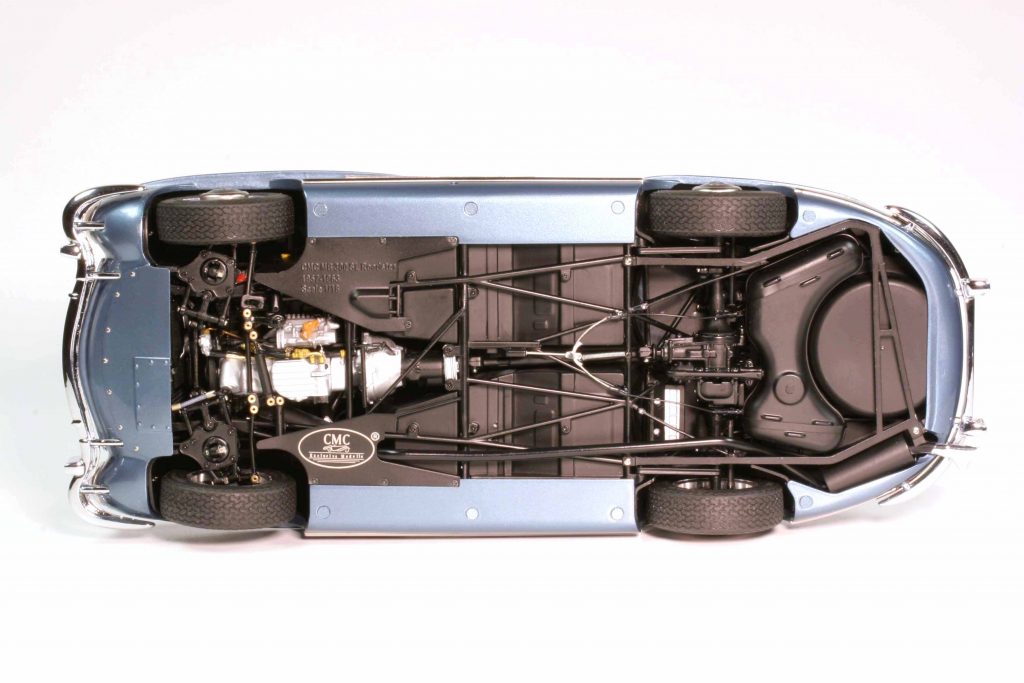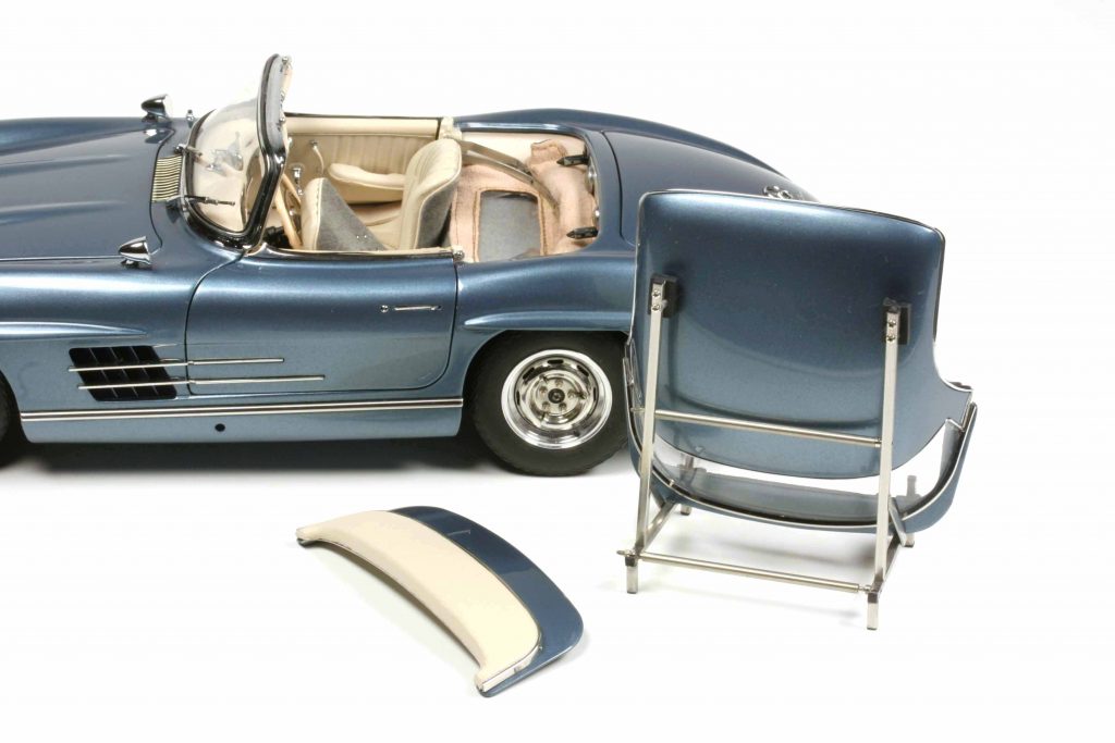 Ein CMC-300er besteht aus +/- 1050 Teilen, unterschiedlich je nach Variante. Manch einer kann etwas, das ein anderer nicht kann, beispielsweise mit der Handkurbel zu betätigende Seitenscheiben. Gemeinsam ist allen Modellen, dass sie selbstverständlich all open, gelenkt und gefedert sind. Die Hauben haben Abstützstangen, im Heck ein herausnehmbares Reserverad unter der Kofferraummatte und der darunter liegenden Reserveradabdeckung. Um das fünfte Rad zu entnehmen, ist ein klitzekleiner Schaubendreher notwendig (wird mitgeliefert). Die Felgen sind in Karosseriefarbe lackiert und weisen ein verchromtes Felgenbett auf, die Radkappen sind (ohne Werkzeuggebrauch) abnehmbar. Ihr Innenbereich ist ebenfalls in Karosseriefarbe gehalten. Die Räder lassen sich abnehmen, benötigt wird dazu ein Innensechskantschlüssel (wird mitgeliefert). Der Sechszylinder-Reihenmotor ist ein Ausbund an Detailfülle, keine Leitung und kein Kabel wurden vergessen. Das Gleiche gilt für den Innenraum. Die Sitze sind klappbar und mit Leder bezogen, das Armaturenbrett hoch detailliert. Der Aschenbecher kann geöffnet werden. Das ist wichtig, denn zu W198-Zeiten rauchte jeder. Die Sonnenblenden sind klappbar und die Scheibenwischer lassen sich vorsichtig anheben. Der Bauch des 300 SL entspricht qualitativ der Draufsicht und dem Motor: absolute Wirklichkeitsnachbildung bis hin zu kleinsten Bremsleitung, die Radaufhängungen und die Pendelhinterachse sind ein Traum. Der Verdeckkastendeckel ist beweglich – außer beim Rallyemodell, des Überrollbügels wegen, und dieses verzichtet als Einziger auch auf die ausfahrbare Radioantenne, die bitteschön mit einer Pinzette und nicht mit den Flossen zu bedienen ist. Zu all open zählt bei CMC auch der Tankdeckel. Um die Türen zu öffnen, agiert der Modellautosammler gleich wie der „echte“ Mensch, der ins „echte“ Auto einsteigen möchte; er klappt die bündig versenkten Türgriffe aus.