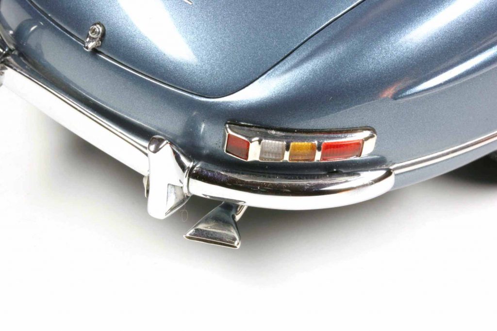 Es sind so viele, unglaubliche Kleinigkeiten, die faszinieren. Die Einzelheit stellvertretend für das Ganze: der Hupring. Andere Hersteller machen ihn aus verchromtem Plastik. CMC schafft ihn aus verchromtem Metall, aber nicht mit glatter Oberfläche, sondern mit genau der Riffelstruktur des Originals. Klappbare Scheibenwischer dürften in 1:18 wohl das erste Mal überhaupt realisiert worden sein. Die Wischer selbst bestehen aus mehr Einzelteilen als so manch ganzes 1:43-Modell. Und der Aschenbecher an der Armaturenbrettoberseite: Nicht nur eine Klappe, sondern auch seine Innereien sind vorhanden, das Gitter, auf dem die Zigarette ausgedrückt wird, darunter der Schacht für die eigentliche Asche. Das einzige, was uns nicht vorbildgerecht erscheint und worüber wir uns wundern, dass dies bei Modellautos offenbar nicht umsetzbar ist: Schön ist, dass die Lenkbewegung mit der Drehbewegung des Lenkrades gekoppelt ist, aber das ist eigentlich nichts besonderes. Die Frage ist nur, warum bei so viel Vorbildtreue die Drehuntersetzung nicht nachgeahmt wird. Man kann nicht kurbeln. Das Lenkrad dreht sich nur um eine halbe Umdrehung und erledigt damit den kompletten Lenkvorgang von Anschlag zu Anschlag.
