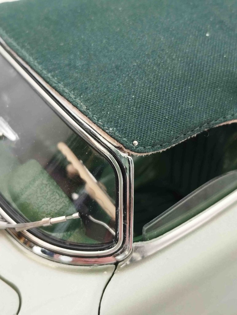 Unser Muster ist ein Vorserienmodell der allerletzten Vorserie. Zwei Dinge entsprechen nicht dem definitiven Auslieferungszustand: Offensichtlich ist, dass die Felgen komplett verchromt sind. Ihr Mittelteil, also die Radschüssel oder Radscheibe, ist nicht in Wagenfarbe lackiert (die Radkappen aber schon). Sodann der Innenhimmel des Hardtops. Der ist wahrlich nicht schön, mehrteilig zusammengefummelt. In der Serie wird der Innenhimmel einteilig und aus Kunstleder bestehen – ganz so, wie es „in echt“ auch ist.