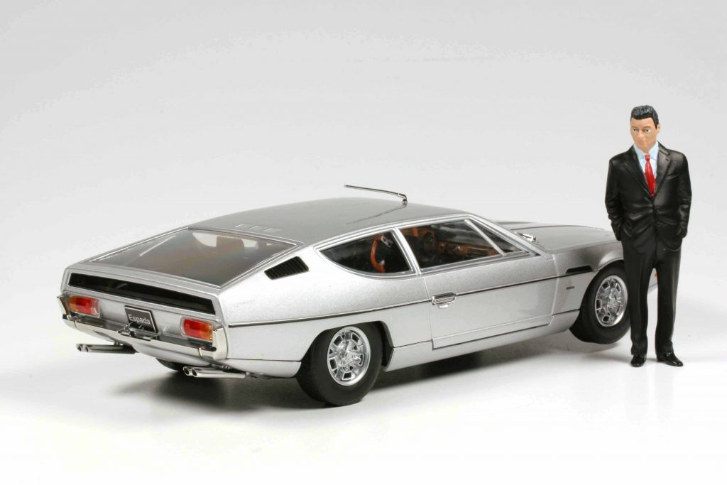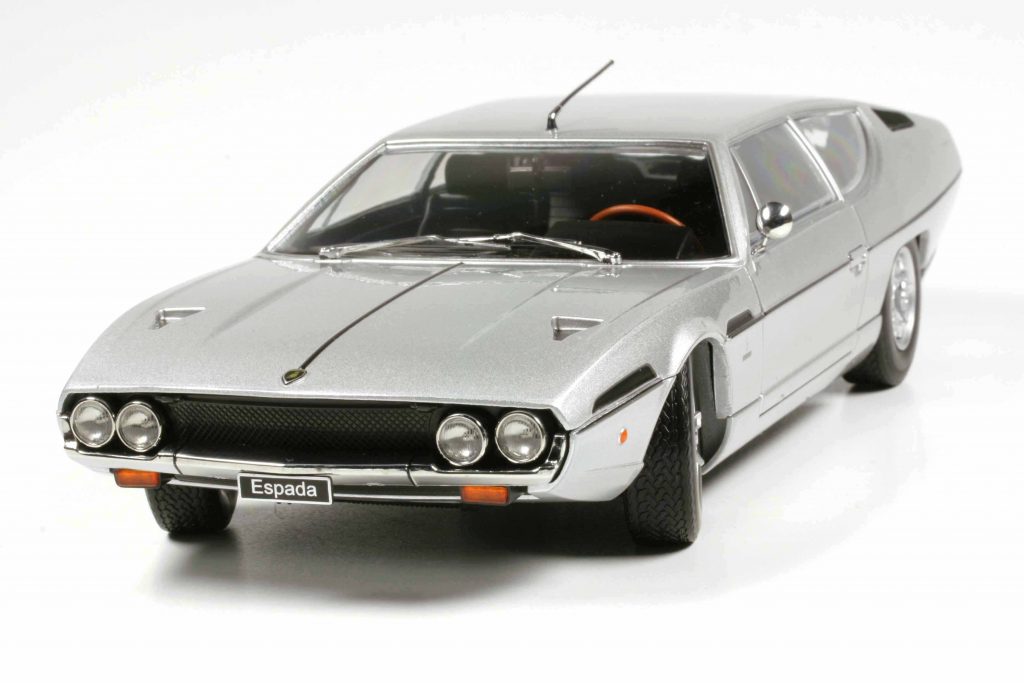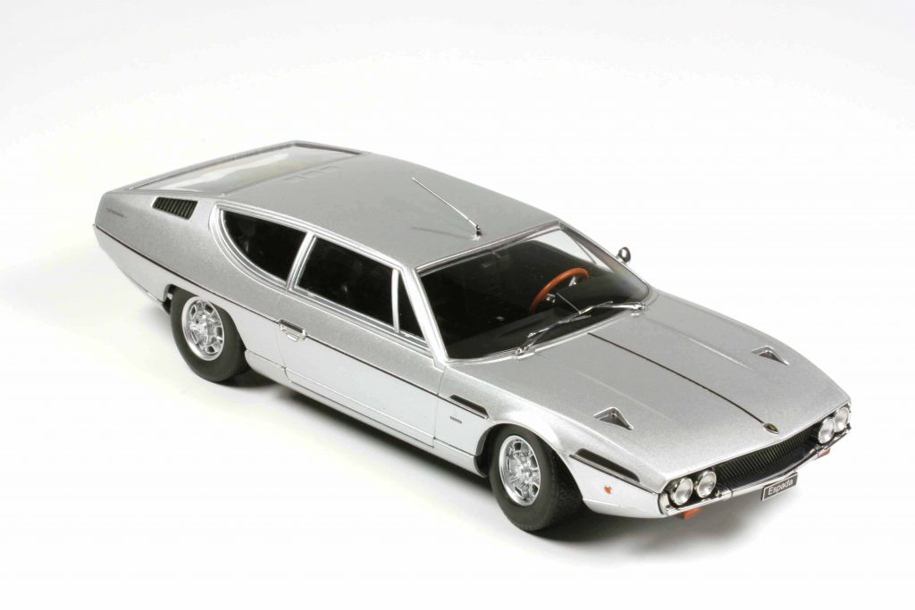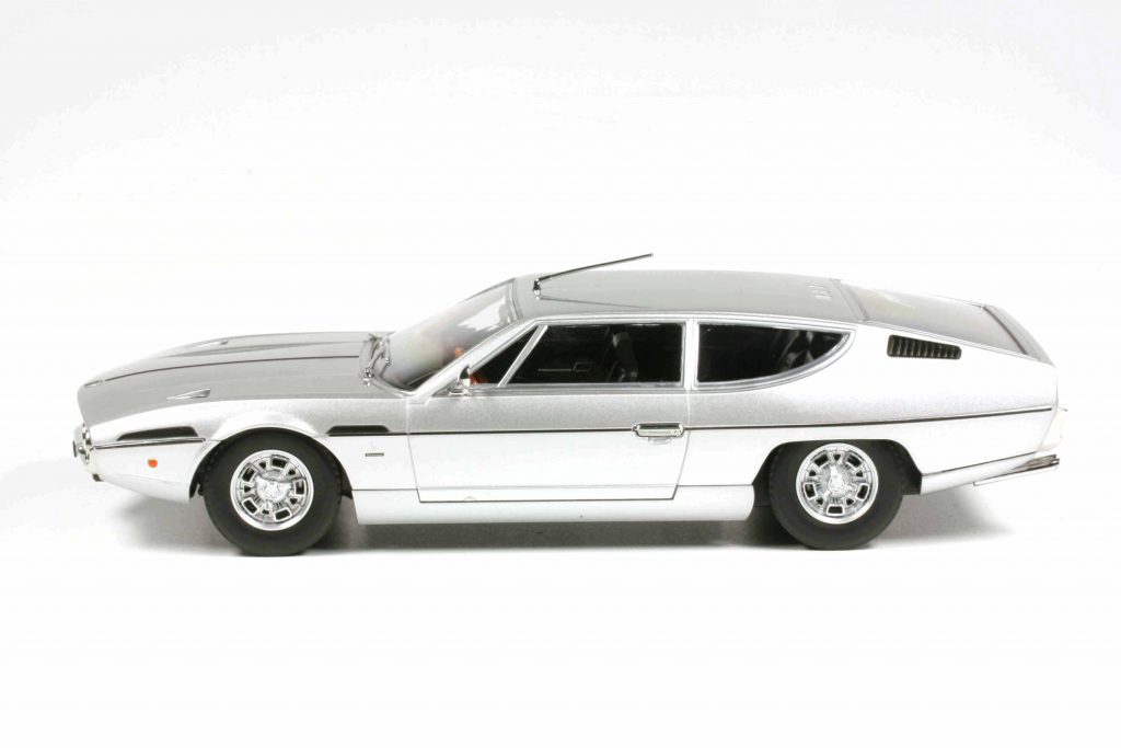 Nach vielen Jahren und dem Bedauern, damals nicht das exzellente Modell von Autoart gekauft zu haben, das auch als Modell unter einem ähnlichen Kostenproblem wie der Große litt und das bis heute als gebrauchtes Modell auch immer noch tut, hat KK-Scale endlich ein Erbarmen und gönnt uns eine erschwingliche Variante. Diese scheint nicht ganz ohne Schielen nach der Autoart Version entstanden zu sein, was natürlich der formalen Qualität zugutekommt, denn entgegen seiner üblichen Gepflogenheiten hat der Hersteller den unteren, eingezogenen Schwellerbereich als separates Formteil ausgeführt, auch wenn er vielleicht etwas zu stark verrundet sein mag. Das Original trägt hier eine Längskante, aber das Studium vieler Originalbilder lässt eine gewisse Varianz bei den Originalen vermuten. Unseren Testwagen haben wir in hellsilber metallic geordert. Da kommen die sauber kontrastierenden, schwarzen Designelemente und Zierlinien besonders streng und clean heraus. Der Espada war auch sehr bunt zu haben, aber die seriöse Farbgebung steht ihm ausgezeichnet und macht ihn auch für ein konservativeres Publikum bestellbar. Außerdem trägt nur diese Variante, KK-Scale bietet deren vier an, die wunderschönsten Lamborghini Felgen aller Zeiten, die wir vom Miura her kennen. Es könnte also ein sehr früher Espada sein, der hier mit einem schwarzen Interieur ausgestattet ist. Dieses zeigt allerdings ein späteres Armaturenbrett, das eher konventionell als originell die erste Ausführung ablöste, die auf den vom Marzal her bekannten Sechsecken beruhte. Hier wird nun Schwarz mit Holz kombiniert und verschiedene silberne Bedruckungen heben die Details hervor. Dies alles ist aufgrund der großzügigen Verglasung gut zu betrachten. Die Unterseite des Modells zeigt erkennbar die Fahrwerkskonstruktion und lenkt den Blick auf die wegen des großen Hecküberhanges überlangen verchromten Endrohre, die sehr dünnwandig wirken. Alles in allem ein erfreuliches Modell mit kleinen Fragezeichen am Unterbauch, das eine viel zu lange Wartezeit beendet.