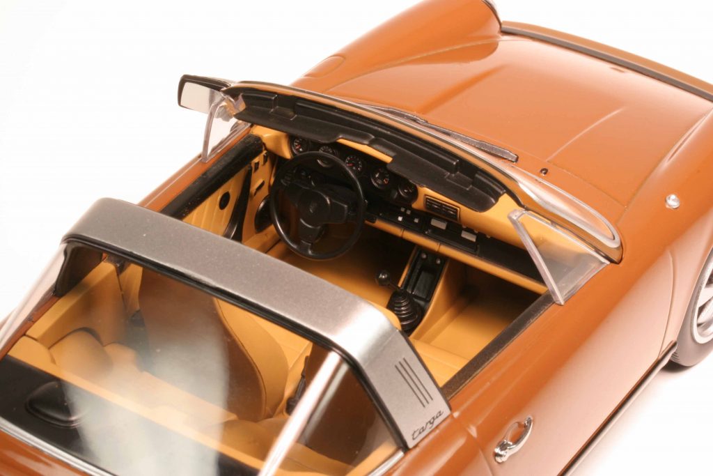 So verhält es sich auch mit dem kaffeebraunen Porsche 911 G-Modell in Targa-Ausführung. Das Modell ist nicht neu. Wenn wir auf der Website des Herstellers in die dankenswerterweise übersichtlich aufgelistete Bildergalerie der bisher produzierten Modellautos schauen, findet sich der Targa baugleich schon seit relativ langer Zeit im Programm. Das tut der Qualität des Modells keinen Abbruch. Er gehörte damals schon zu den gelungeneren Exemplaren der Marke.