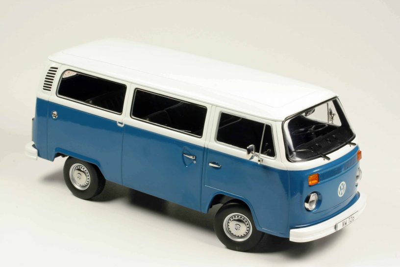 Am T2a hat sich Schuco abgearbeitet, alle möglichen Varianten, ein prima gemachtes all-open-Modell. Einen T2a Pritschenwagen gibt es als Budgetmodell von Solido. Und den T2b? Nun ja, in 1:12 recht schön von Ottomobile in Resine, in 1:18 bislang nur von Greenlight, zweifellos hübsch, aber nicht allzu verbreitet und obendrein kein „normaler“ Bulli, sondern ein Film-Schauspieler (Field of Dreams, Little Miss Sunshine – kennt bei uns kaum jemand!). KK-Scale gibt Vollgas: Etliche zweifarbige Varianten, wahlweise mit Fuchs-Felgen à la 911er, dann kommen Lieferwagen, neutral und in unterschiedlichen Porsche-Rennservice-Livrées – KK-Scale-Inhaber Martin Kosmann weiß ganz genau, dass er damit einen Bestseller im Angebot hat, den er bis zum Gehtnichtmehr ausschlachten kann. Hoffentlich ließ er die stählernen Werkzeugformen gut härten, damit sie unter dem Ausstoß nicht zu sehr ächzen und die Segel strecken. Denn diese Werkzeuge sind zur Schwerstarbeit verdammt: Wohl kaum ein Fahrzeug ist in so vielen Beschriftungs- und Farbvarianten denkbar wie der VW T2b. Jeder Handwerker, jede Firma, jeder Konzern, jede Polizeidienststelle, jede Feuerwache, jede Rettungsorganisation hatte einen T2b, der T2b war immer und überall – und kein Deutscher, Österreicher oder Schweizer über 40 hatte während seines Lebens nicht irgendeinen Kontakt mit dem VW T2b. Der Kontakt des Verfassers dieser Zeilen mit dem T2b war in Natooliv lackiert, hatte ein Y-Kennzeichen und wurde während meiner Dienstzeit vom T3 abgelöst. Ich fuhr den T2b lieber. Er war handlicher. Er erinnerte mich eher an meinen damaligen VW Käfer.