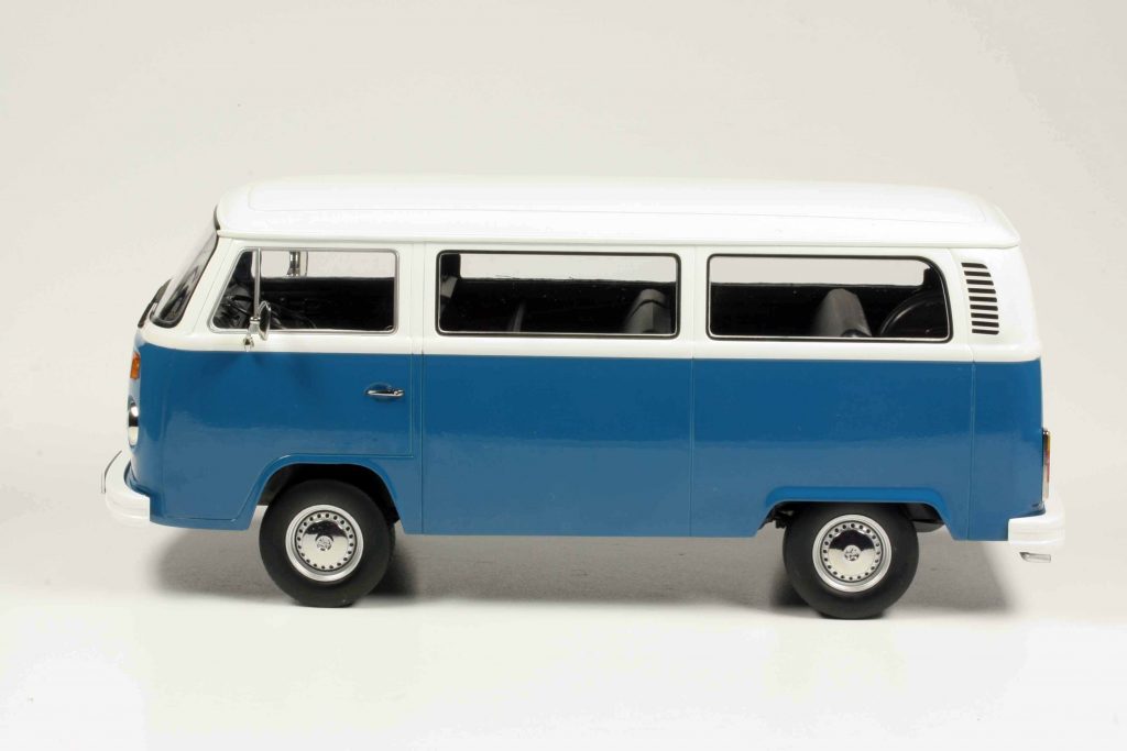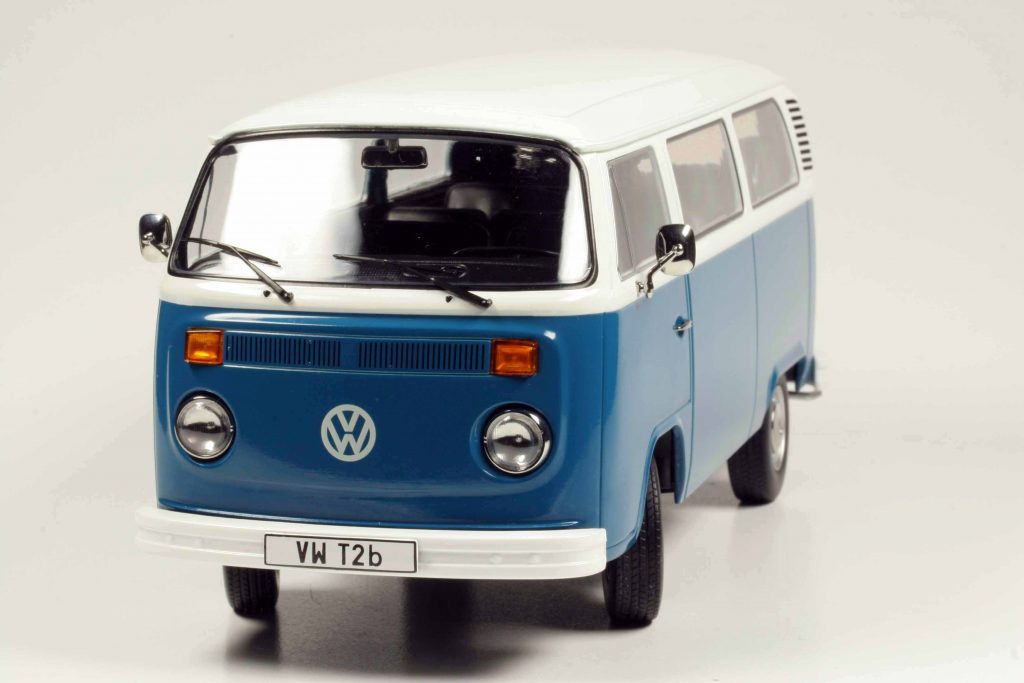 KK-Scale 1364 Volkswagen T2b Bus mit Stahlfelgen 1974 blau/weiß. Fertigmodell Zinkdruckguss, Maßstab 1:18. UVP 79,95 Euro.