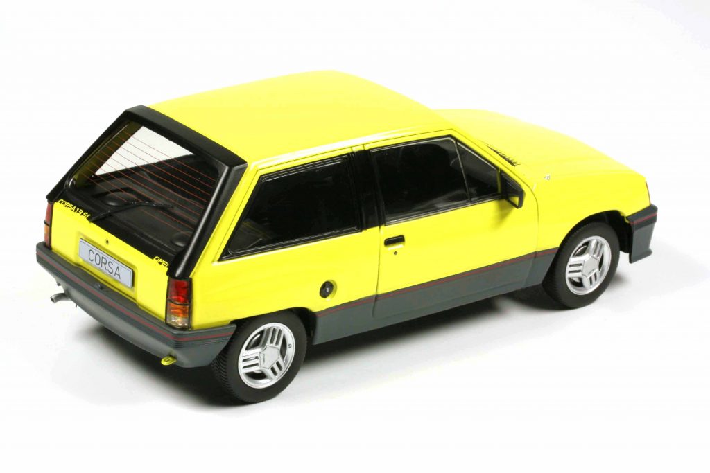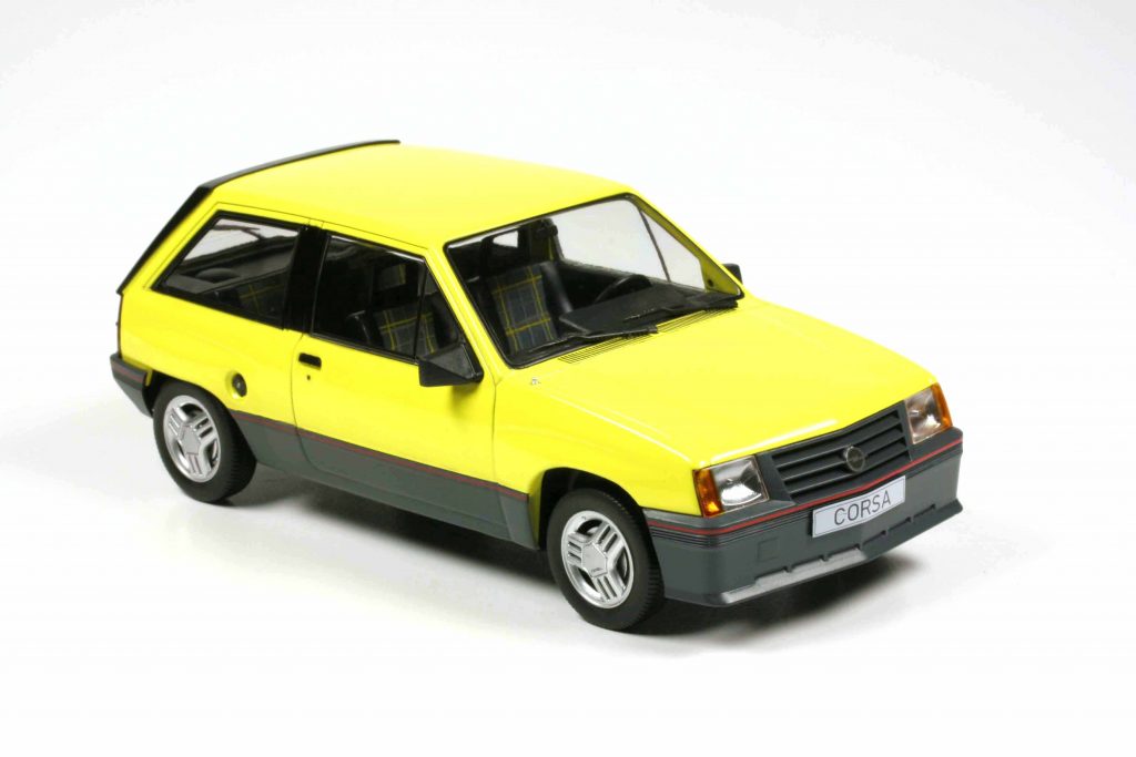 MCG 18431 Opel Corsa A SR 1983 gelb, 18432 Corsa A Sprint 1983 weiß, 18433 Corsa A Custom dunkelrotmetallic. Fertigmodelle Zinkdruckguss, Maßstab 1:18. UVP je 64,95 Euro.