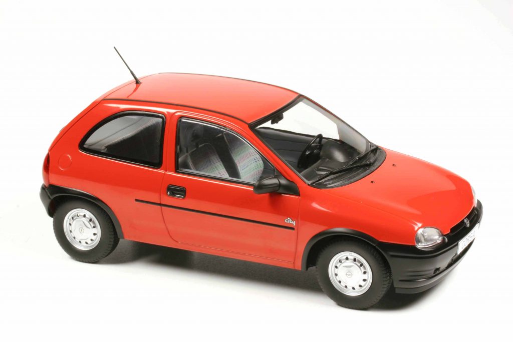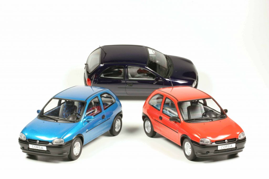 MCG 18513 Opel Corsa B City 1993 rot, 18514 dito Joy türkismetallic, 18905 dito Atlanta schwarz und 18515 dito GSI 1993 silber. Fertigmodelle Zinkdruckguss, Maßstab 1:18. UVP je 64,95 Euro.