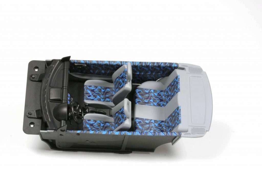Der Rote ist die Standardausführung, ein Corsa City mit hellgrauer Innenausstattung, Sitzflächen im Design von Tischdecken für Balkon oder Küche, ein absolut unprätentiöses Stino-Auto mit Stahlfelgen und kleinen Plastikradkappen. Für ihn gilt, ebenso wie für die anderen Corsas (Corsen, Corsaren?) eine absolut passgenaue Form, vordere und hintere Abschleppöse in den Stoßfängern, Dachantenne, vorbildgetreue Dekoration. Er ist laut Heckschriftzug ein 1,2i, an den Türen das „City“-Emblem. So schön er von oben ist, so wenig sehenswert ist das Chassis, und nach wie vor bedauern wir an MCG-Modellen ihre Starrachsigkeit. Lenkbare Vorderräder würden den Eindruck sehr beleben. Das Sondermodell Atlanta mit dreispeichigen Alufelgen, das „in echt“ ein Glasschiebedach hatte (fehlt am Modell) ist in schwarzem Unilack gehalten. Dem Schwarz ist ein Hauch Blau beigemischt, aber um es „Dunkelblau“ zu nennen, ist es zu schwarz. Der Atlanta, ein 1.4i, verfügt über ein etwas langweiligeres Interieur, auch hellgrau, die Sitzflächen zwar bunt gepunktet, aber eben so dunkelbunt, dass es beinahe schwarz wirkt. Er ist, wie der rote Joy, mit dem Lenkrad mit Airbag, also 1994er Modell, ausgestattet. Der GSI 16V ist silbern (Rauchgraumetallic), innen hellgrau mit Polsterdesign „Network“. Auch er hat die passende Dekoration, Bespoilerung und die typspezifischen Alufelgen im 3-Dppelspeichen-Design, damals aufpreispflichtig. Er liegt uns nicht als Fotomuster vor. Bleibt der Joy, ebenfalls ein 1.2i, mit (uninspiriert gestalteten) Plastikradkappen auf Stahlfelgen – also die vierte Felgenvariante des MCG-Corsa. Er muss ein ganz frühes Fahrzeug sein, denn hier verbaute MCG das airbaglose Lenkrad. Er besticht durch eine absolut fetzige Außenfarbe, ein sehr intensives Türkismetallic mit Opel-Namen Karibikblaumetallic (obgleich in unserer Wahrnehmung das Grün über das Blau herrscht). Das war eine sehr typische Corsa-B-Farbe, äußerst cool. MCG kombiniert sie mit einem poppigen Interieur, das so schön bunt ist, dass wir es einfach zeigen wollen. Für dieses Unterfangen war uns die Mühe nicht zu viel, das Auto zu zerlegen (geht ganz einfach, vier Kreuzschlitzschrauben), denn durch die geschlossenen Scheiben könnte die Kamera dieses Farbenmeer nicht einfangen.