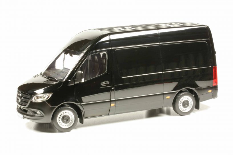 Norev machte also einen Sprinter, einen aktuellen der Baureihe 907, lang und hoch, typisch eben. Es gab weiße Sprinter, silberne Sprinter, es gab sogar eine spezielle „Dealer-Edition“ im Brutalismus-Look, nämlich unlackiert (2000 Stück für Daimler-Benz). Stöbert man auf Ebay, so finden sich Exemplare für 300 oder mehr Euro, und es gibt tiefergelegte, getunte Bastel-Sprinter, denen Lambo-, Bentley-, Maybach- oder AMG-Felgen transplantiert wurden und die der Ersteller voll Stolz und in guter Hoffnung auf ebensolchen Reibach anbietet. Der Sprinter ging an der Sammlergemeinde wahrlich nicht vorüber, sondern traf sie – oder zumindest Teile von ihr – voll ins Herz! Das ging natürlich auch an Norev nicht spurlos vorbei – wie überhaupt keine Entwicklung auf dem Gebrauchtmodellmarkt an den Herstellern vorbei geht. Daran sehen sie, was aus ihrem Programm Konjunktur hat und somit bei Wiederauflage gute Verkäufe verspricht. Den Hype eines eigenen Modells kann kein Hersteller ignorieren – und tut es auch nicht. Also macht Norev jetzt wieder einen Sprinter. Schwarz wie ein Bestattungswagen oder ein Teufelszeug ist er, rabenschwarz eben. Bei Daimler-Benz heißt das Tiefschwarz 9040 und kostet keinen Cent Aufpreis. Der Vorteil ist, dass an einem schwarzen Sprinter die dunkelgrauen Riesenkunststoffformteile vorne und hinten, vulgo die Schürzen, nicht als solche auffallen. Der Sprinter sieht somit aus wie aus einem Guss. Es gibt ihn in drei Ausstattungslinien, Base, Pro und Select. Ohne Lust darauf zu haben, am Computer nun einen Sprinter zu konfigurieren, attestieren wir Norev, das Basismodell zu miniaturieren: Stahlfelgen ohne Radkappen, unlackierte Stoßfänger. Norev macht den Kastenwagen mit hohem Dach in mittlerer Länge, als Hecktriebler mit hinterer Einzelbereifung, ein Sechs-Meter-Transporter (L2) mit dem H2-Dach, also Hochdach mit Stehhöhe im Laderaum, und in Sprinterkreisen spricht mal also vom L2H2. Das ist eigentlich der vielseitigste Allrounder und bietet die meist georderte Balance zwischen Fahrtauglichkeit (= Wendigkeit im Stadtverkehr) und Platzangebot.