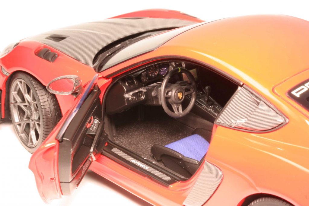 Wir vergleichen nicht. Wir sind deskriptiv. Vor uns steht ein 718 Cayman GT4 RS, im Original im Rohzustand 158.700 Euro teuer, und Minichamps bescherte ihm Extras für 19.000 Euro, Gesamtpreis genau 177.686,44 Euro. Teilt man diesen Preis durch 18, schaffe also einen 1:18-Preis, so kommt man auf 9871 Euro. Das Minichamps-Modell hingegen kostet 210 Euro, ist also deutlich günstiger. Den Einwand, dies sei eine Milchmädchenrechnung, lassen wir gerne gelten. Der Cayman ist in der ebenso schönen wie klischeehaften Farbe Indischrot lackiert und erfreut sich der serienmäßigen Alu-Schmiederäder in Darksilver, die für diesen Typ geschaffen wurden. Innen das Weissach-Paket mit erweitertem Leder und Race-Tex in Schwarz mit Tiefseeblau, wobei sich letzteres auf die Sitzflächen der Vollschalensitze beschränkt. Außen trägt der Cayman ebenfalls das Weissach-Paket, dazu LED-Scheinwerfer.