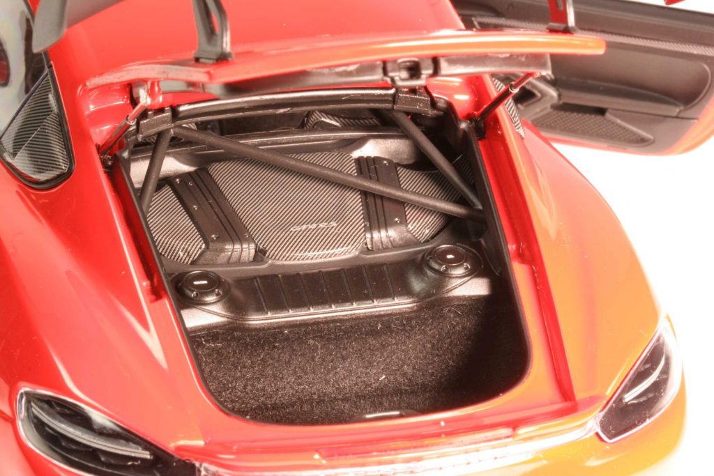 Bei einem Minichamps-Porsche stellt sich die Frage nicht, ob die Form gut getroffen ist. Sie ist es. Es stellt sich allenfalls die Frage, wie das Modell im Detail umgesetzt ist. Das Modell sieht genauso aus wie das Foto des konfigurierten Original-Porsche. Das ist schon mal gut! Auf den Türen der Dekorschriftzug „GT4 RS“, der gleiche Schriftzug auch am Heck, auf der Spoilerlippe ist der Schriftzug geprägt. Die vorderen Kühlluftöffnungen und Lufteinlassgitter sind Fotoätzteile und die Lufteinlässe hinter den Türen sind in Sichtcarbon ausgeführt, was Bestandteil des Weissach-Paketes ist. Das gilt auch für den Frontdeckel, das Carbon schön strukturiert, güld’nes Porsche-Zeichen, NACA-Lufteinlässe. Der Heckflügel ist nicht in Carbon-Optik, sondern mattschwarz, das gehört so. Das Original ist dreistufig verstellbar, Minichamps führte den Flügel starr aus. Beide Deckel öffnen mit Haubenliftern und halten im richtigen Winkel auf. Unter der Vorderhaube ist nichts Sensationelles zu entdecken, und vom 500 PS starken 4-Liter-Saugmotor sieht man aufgrund seiner Mittelmotorlage nicht viel von oben und gar nichts von unten, denn der Unterboden ist komplett verkleidet.