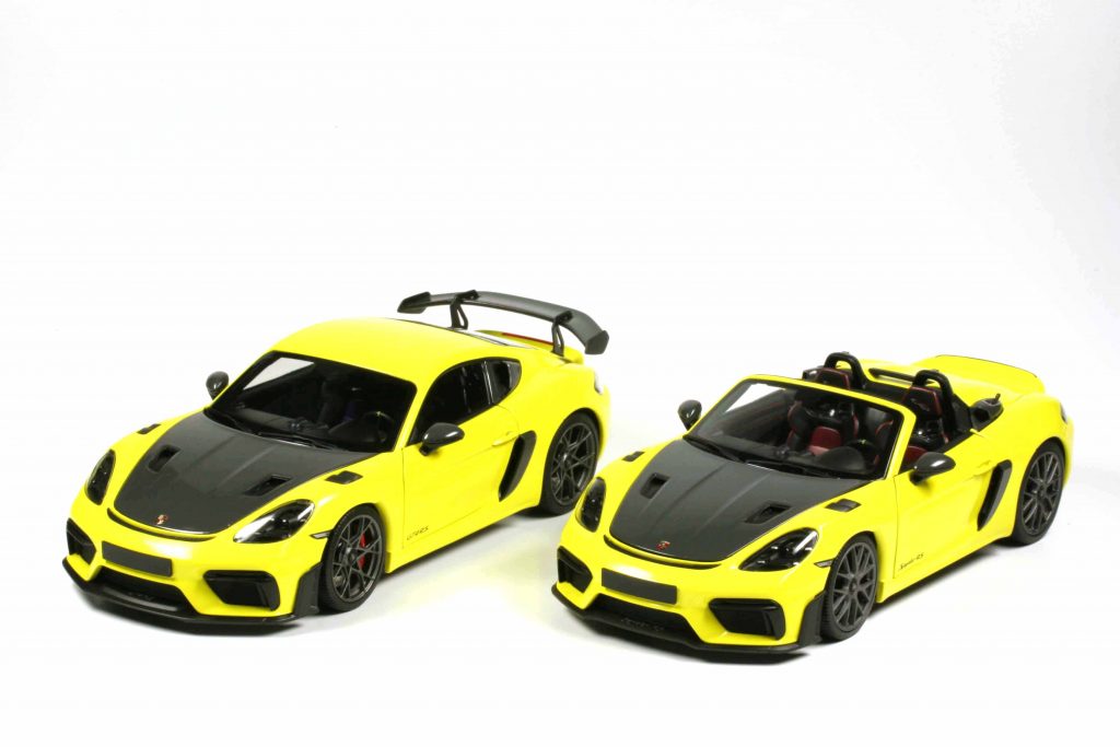 Minichamps 110063132 Porsche 718 Boxster (Typ 982) Spyder RS mit Weissach-Paket 2024 gelb und 110062124 Porsche 718 Cayman (Typ 982) GT4 RS 2024 gelb. Fertigmodelle Zinkdruckguss, Maßstab 1:18. UVP je 209,95 Euro.