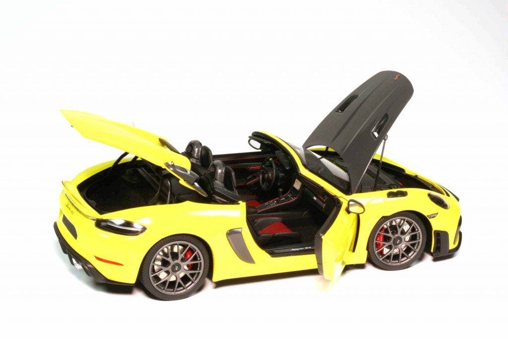 Wie zweieiige Zwillinge sind sie gehalten, die beiden neuen Farbvarianten des Mittelmotor-Porsche von Minichamps. 718 RS Spyder und GT4 RS in Speedgelb mit Weissach-Paket, unterschiedliche Felgen in gleichem Farbton, innen schwarz mit roten oder blauen Sitzflächen – also ziemlich, aber nicht ganz identisch. Passen bestens nebeneinander!