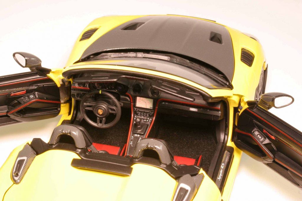 In 1:1 ist es derzeit nur noch eingeschränkt möglich, einen solchen Porsche zu erwerben, die Produktion wurde im Oktober beendet, käuflich ist, was produziert ist – keine individuelle Konfiguration mehr möglich. Aber gelbe Spyder RS und GT4 RS gibt es genügend, auch mit Weissach-Paket. Diese Farbe steht einem Hochleistungs-Porsche einfach supergut, und neben Rot-Schwarz und Orange-Schwarz ist Gelb-Schwarz die schärfste Farbkombination für einen Supersportler. Minichamps setzt das ganz hervorragend um, mit viel sauber gemachtem Sichtcarbon, hochglänzend, die roten Bremssättel als knalliger Akzent hinter den in dunklem Silber gehaltenen Schmiederädern. Vielleicht wäre nett gewesen, dem Coupé ebenfalls das farblich abgehobene Stitching im Inneren zu bescheren, vielleicht wäre die Zwillingsschöpfung noch identischer geworden, wenn beider Sitzflächen im selben Farbton gehalten wären – vielleicht auch nicht, denn eineiig sollten sie wohl nicht sein.