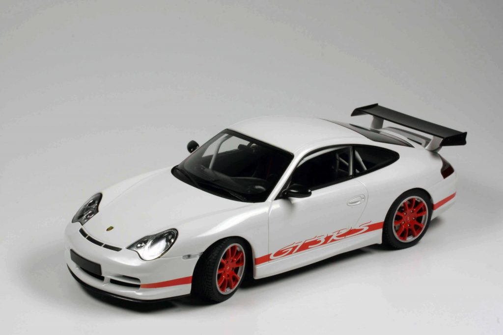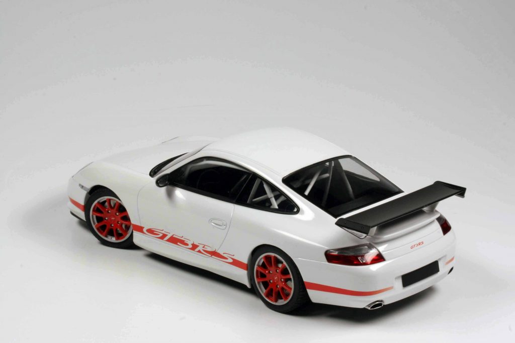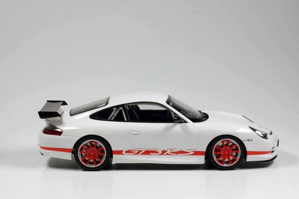 Den ersten GT3 RS, also den Typ 996/II, hatte Minichamps bisher noch nicht im Programm (kaum zu glauben, dass es einen alten Elfer gibt, der im Minichamps-Portfolio noch gefehlt hat!) und entschied sich zum sealed-Layout, somit nichts zu öffnen, gelenkt zwar, aber nicht gefedert – aus Minichamps-Sicht also Budget-Bauweise, die 120-Euro-Kategorie. Keine Frage, das Modell ist prima. Etwas anderes kann und sollte sich Minichamps in Sachen Elfer-Historie auch nicht leisten. Natürlich wird es Sammler geben, die lieber das Doppelte ausgeben würden und dafür ein all-open-Modell hätten. Aber es ist eben, wie es ist. Das Modell ist im typischen Minichamps-Porsche-Stil gehalten, passt sehr gut zu seinen Brüdern, die Lackierung ist einwandfrei (der Farbton heißt Carraraweiß, nicht wie dereinst Grandprixweiß), der Flügel und die Spiegelschalen gehören zu den wenigen Teilen, die vor über 20 Jahren bereits Sichtcarbonteile waren, im tiefschwarzen Inneren sticht der reinweiße Überrollkäfig ins Auge, hinter den Felgen die damals schon roten Bremssättel.