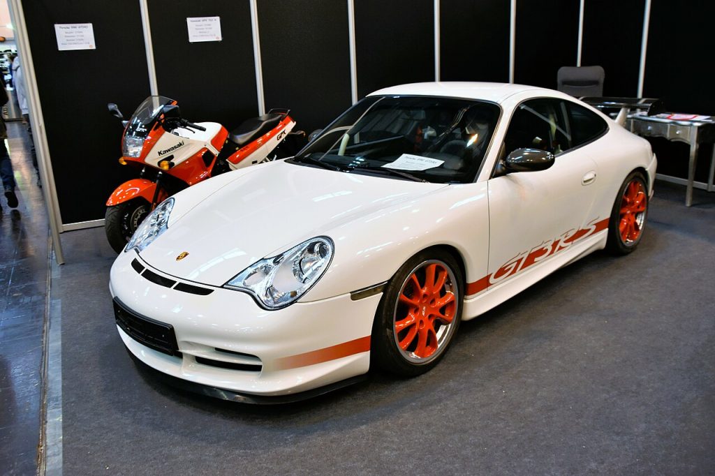 Minichamps 155062020 Porsche 911 GT3 RS (Typ 996/II) 2003 weiß mit orangeroten Streifen. Fertigmodell Zinkdruckguss, Maßstab 1:18. UVP 119,95 Euro.