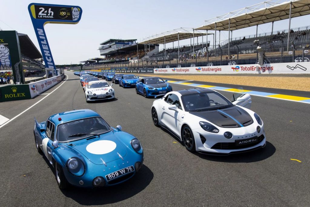 Schön in Szene gesetzt: Alpine A110 R Le Mans von 2023 in Le Mans vor leeren Rängen, eskortiert von vielen, vielen aktuellen A110 und flankiert von einer Alpine M63, dem ersten Alpine-Rennsportwagen von 1962.