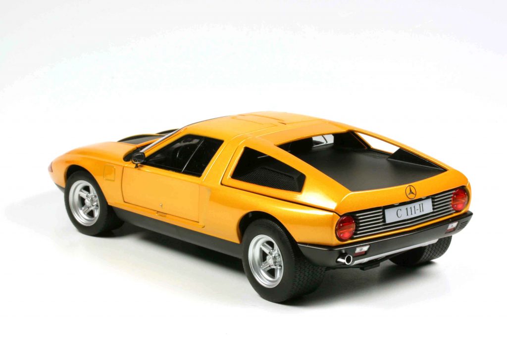 Surrealistische Traumwagen waren sie alle drei, aber dem Mercedes wurde allgemein am ehesten eine Serientauglichkeit zugetraut. Deswegen wurden auch Blankoschecks für ihn unterschrieben, die Daimler-Benz nie einlösen konnte. Unter den Dreien ging der C111 eindeutig als Sieger hervor. Davon deuten bis heute unzählige Spielzeug- und Modellautos – zeitgenössisch gab es vom Modulo nur 43er von Politoys und Pilen, einen 32er von Mercury und einen kleinen Corgi Juniors, vom Opel CD sogar nur eine Miniatur, von Politoys in 1:43. Die kleinen Jungs und die erwachsenen Männer waren vom C111 geradezu hingerissen – zunächst, weil er von Daimler-Benz kam, erzsolide und erzkonservativ, technisch innovativ, aber mitnichten mutig-revolutionär. Niemand hätte Mercedes einen solchen Wagen zugetraut, aber jeder verband mit ihm die positiven Mercedes-Sekundärtugenden. Dann, weil er einen Wankelmotor trug. Er galt in der Zeit zwischen 1967 (Debüt NSU Ro 80) und 1973/74 (Beginn Ölkrise und automobiles Effizienzdenken) als Technologie der Zukunft, als überlegener Ersatz für den Ottomotor. Und dann, weil er ein hinreißendes Design trägt, das noch heute fasziniert. Es ist nicht auf einen Stilisten zurückzuführen, man kann nicht sagen: „Er war es, der den C111 entwarf!“ Der Ur-C111, der so genannte Hobel, hatte letztlich gar kein Design, sondern nur eine ungehobelte Hülle um seine Technik. Der C111-I und -II, in letzterer Form der C111 allgemein in Erinnerung geblieben ist und den Norev nun bringt, wurde im Team um den Mercedes-Stilisten Josef Gallitzendörfer gezeichnet, der neu ins Team gekommene Bruno Sacco koordinierte die Karosserieentwicklung. Und zur Berühmtheit trug natürlich auch die schillernde Lackierung in Orangemetallic bei, damals etwas Unerhörtes. Die Bezeichnung lautet Weißherbst, ist dem Weinbau entliehen und wurde von der BASF-Tochter Glasurit angemischt. Die Öffentlichkeit sah im C111-II den legitimen Nachfolger des 300 Flügeltüren-SL, traute Daimler-Benz zu, den Wagen zur Serienreife zu entwickeln und Deutschland in den Genuss eines 300-km/h-Autos zu bringen. In Autoquartetten stach der C111 alle aus – nur nicht im Hubraum, denn der ist bei Wankelmütigen bekanntlich sehr klein. Wo keine Kolben nervös auf und ab zappeln, gibt es auch keinen Raum, in denen sich diese bewegen, also heben und senken, können (denn daher kommt ja die Bezeichnung „Hubraum“).