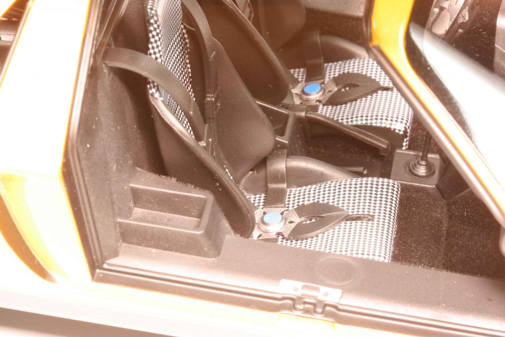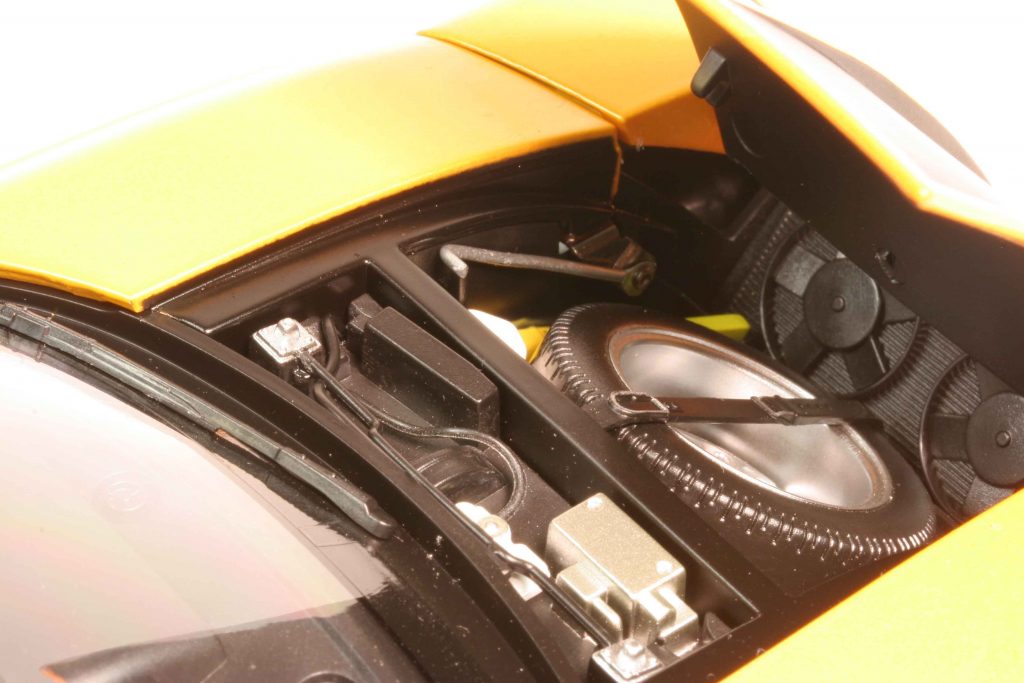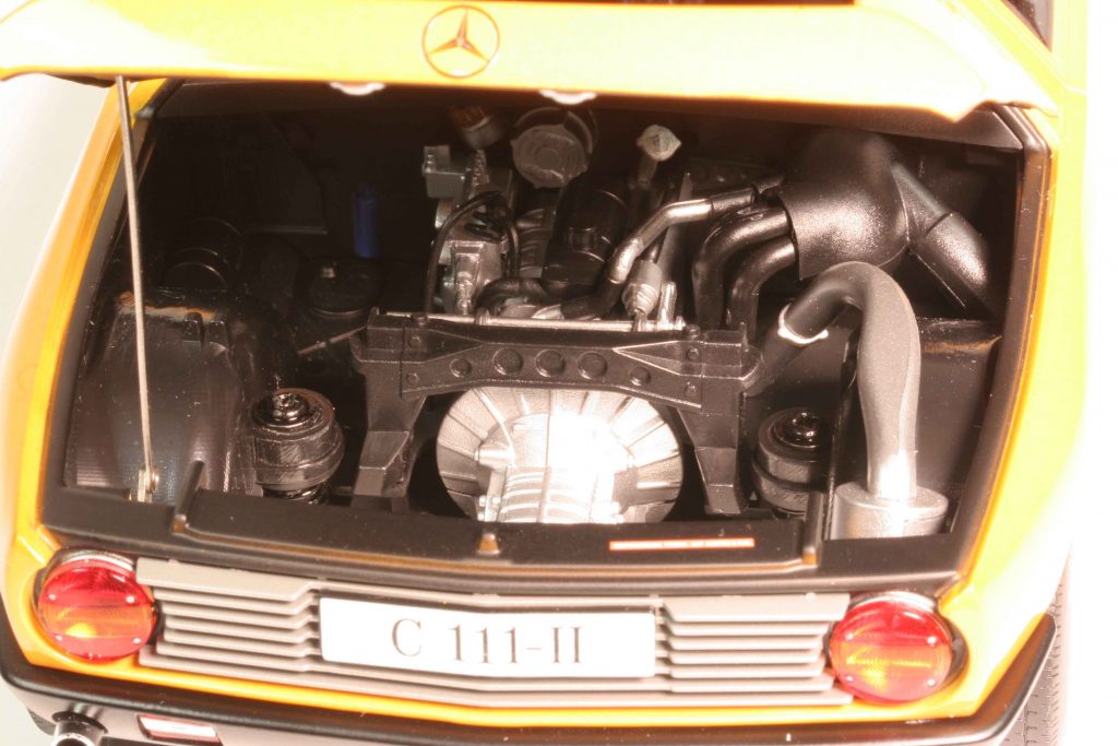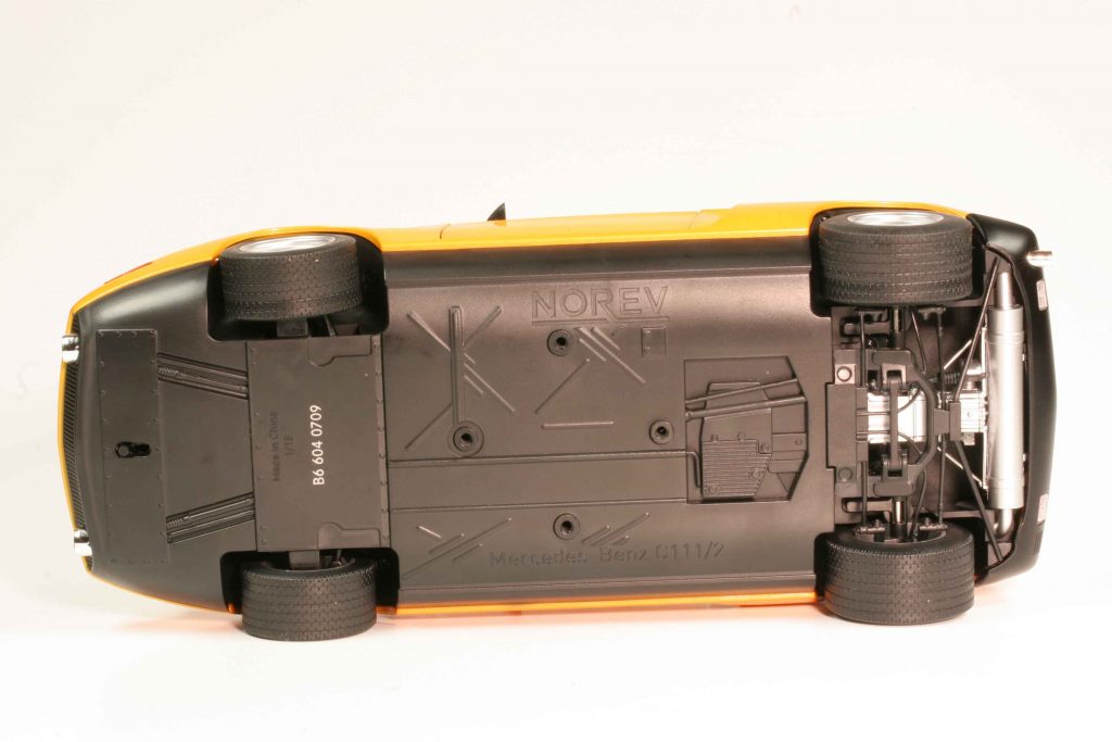 Das Modell erfüllt alle Hoffnungen, welche der Sammler auf den Prototypen setzte, als er auf der Messe stand. Ein wundervolles Automodell! Die Lackierung in Weißherbst ist 1A, und Voss hatte seine liebe Mühe, den Farbton genau zu bestimmen („Ich konnte ja nicht am Original im Mercedes-Museum ein Stück Lack abkratzen.“), denn in den Datenbanken der Lackhersteller findet sich die Zusammensetzung dieser nur am C111 verwendeten Farbe naturgemäß nicht. Das Modell ist nach aktuellen Norev-Prinzipien gemacht, viel Liebe zum Detail gepaart mit hoher Professionalität. Wir finden nichts, was uns missfällt, aber genügend, was uns begeistert – wobei wir zugeben, zu jener Kohorte zu gehören, deren kindliches Autoleben vom C111 mitbestimmt wurde. Grandiose Penta-Felgen, beschriftete Reifenflanken, nur ein Auspuffendrohr, dieses verchromt und hohl, klasse Leuchten, nicht nur die Sitzbezüge mit Pepitamuster, sondern auch die Oberseite der Flügeltüren, passende Sicherheitsgurte, das Interieur vorbildlich-provisorisch (wie das eben bei einem Prototypen ist), die Armaturen hinter Glas, sogar das anormal aufrecht stehende Radio in der Konsole ist nachgebildet. Der Fußboden ist beflockt, ebenso wie die Kofferraumwanne. Ja, und hinten innen, sehr tief verborgen, sitzt der Wankelmotor. Das ist – es scheint uns erstmalig bei Norev – ein separat eingesetztes Aggregat zu sein. Sieht anders aus als jeder bekannte Motor, ist verhältnismäßig klein, hat Zusatzaggregate, die wir mangels Ingenieurausbildung nicht deuten können, aber für ihre Optik und Machart loben. Das Getriebe sitzt hinter dem Motor, darüber ist die Kofferraumwanne situiert.