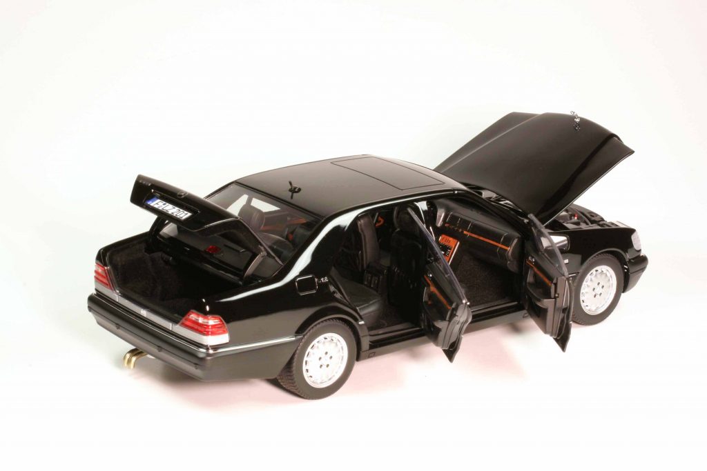 Dieser Endversion in Toppversion (S 600 V12) entspricht das Norev-Modell, optisch kenntlich an den transparenten hinteren Blinkergläsern. Das Modell ist erstmals im Sommer 2016 erschienen, feiert als Modellauto somit seinen zehnten Geburtstag und erscheint nun in Obsidianschwarz mit ebenfalls schwarzer Innenausstattung und viel Holz im Inneren – sogar der Lenkradkranz ist partiell geholzt. Das Modell kann, was es soll (all open, lenkbar, gefedert, Innen- und Kofferraum mit Teppichboden versehen), der Stern ist erfreulicherweise ein verchromtes Kunststoffformteil und kein zweidimensionales Fotoätzteil, die Haubenscharniere sind, dem Alter des Modells geschuldet, ein wenig rustikal, ansonsten absolut feine Konstruktion, Lackierung und Montage. Den Motor würde Norev heute besser detaillieren und dreidimensionaler gestalten, ansonsten ist der Wagen nach wie vor auf der Höhe der Zeit mit ein paar ganz klasse Details wie der dritten Bremsleuchte auf der Hutablage mit separatem Glas oder die Darstellung der Doppelverglasung der Fensterscheiben. Schön ist auch, dass die Abgasanlage nicht nur silbern gehalten ist, sondern einen leichten, matten Goldstich aufweist. Allzu viel Chrom trägt ein W140 nicht, und alles, was glänzen soll, ist am Modell verchromt. Norev konnte komplett auf bedruckte Silberungen verzichten.