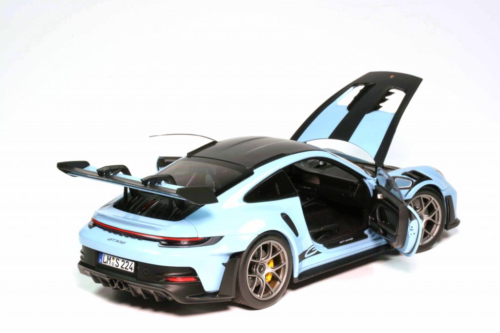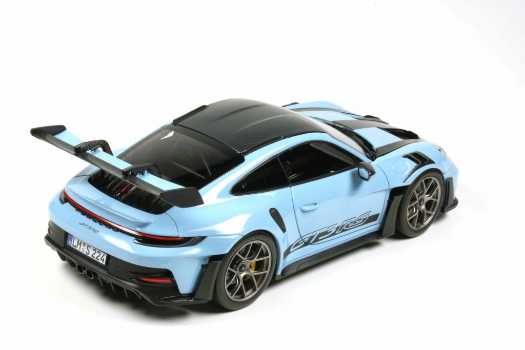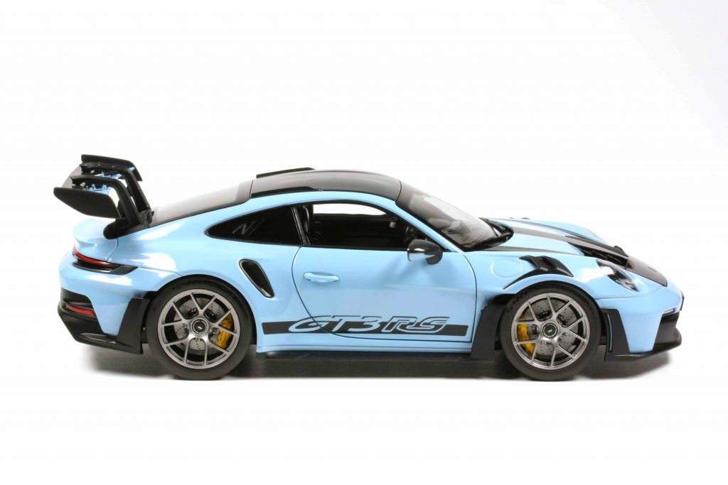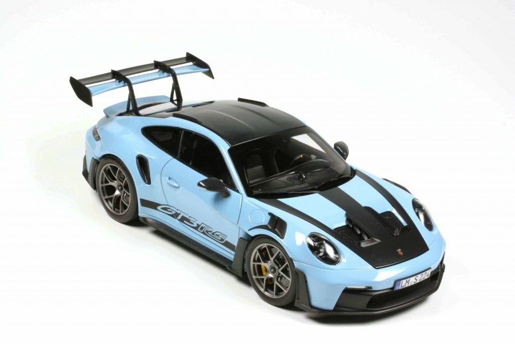 Norev 187367 Porsche 911 GT3 RS (Typ 992/I) mit Weissach-Paket 2021 hellblau. Fertigmodell Zinkdruckguss, Maßstab 1:18. UVP 125 Euro.