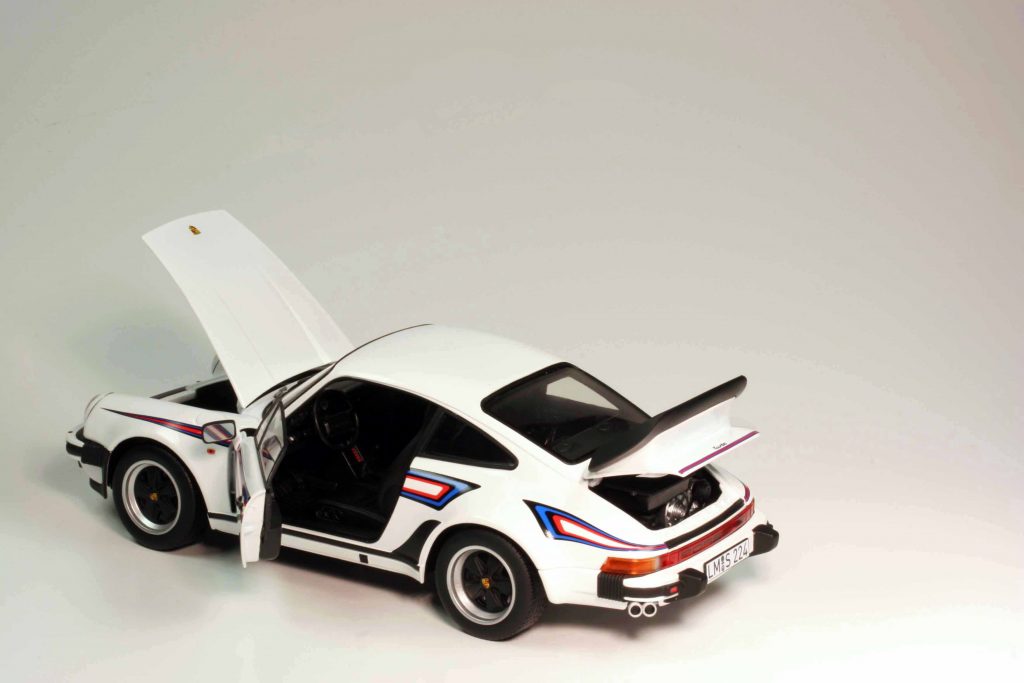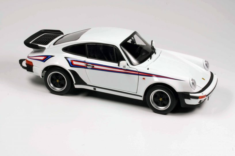 Der Porsche 930 Turbo von Norev ist eine Art Urgestein und gehört zu den frühen Achtzehner-Schöpfungen. Norev ist in diesem Segment seit 2005 unterwegs. Mit dem Auto waren immer alle glücklich – bis auf die Räder. Die zogen die Kritik auf sich, sie seien zu voluminös, die Reifen wurden mit Ballonreifen verglichen. Der stete Tropfen der Kritik höhlte den Stein der Norev-Konstrukteure: Die Aachener Filiale nahm sich des „Oldtimers“ nochmals an und gönnt ihm nun neu konstruierte Räder, die erstmals beim Martini-Turbo zum Einsatz kommen. Und jetzt sieht er richtig gut aus, der alte Turbo. Die Räder haben nun die richtige Größe, die Reifen die richtige Flankenhöhe, die Räder passen zum Auto und werten es ungemein auf. Richtig schöne, runde Füchse, innen mattschwarz, auf der Nabenkappe das Porsche-Logo, das Felgenbett in seidenmattem Silber, also nicht poliert. Der Rest vom 930 Turbo (all open, gelenkt und gefedert) sieht aus, wie er immer aussieht, mit Ausnahme der Streifendekoration, die sich an die Form des Elfers anschmiegt. Norev macht einen 930 Turbo der Baujahre 1984 bis 1989, zu erkennen an der Auspuffanlage mit doppeltem Endrohr (ab 1980) und den in den Bugspoiler integrierten Neblern (ab 1984). Die offizielle Norev-Baujahresbezeichnung „1980“ ist also nicht korrekt.