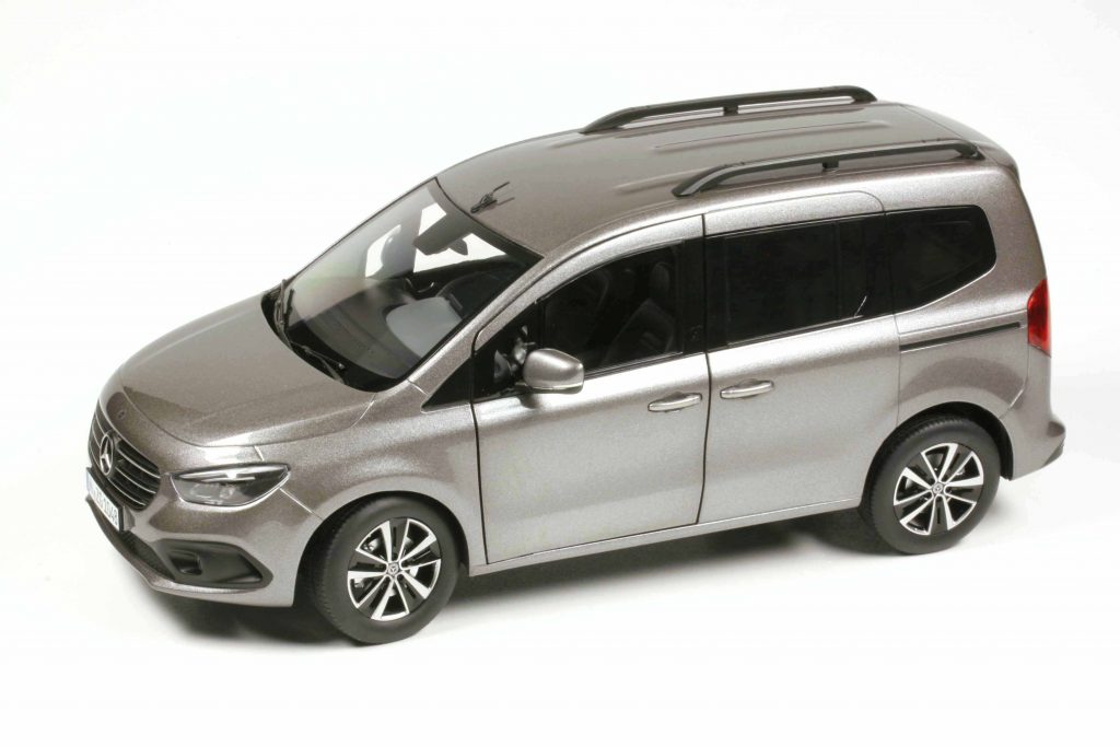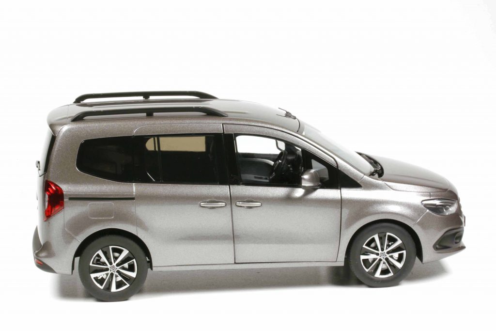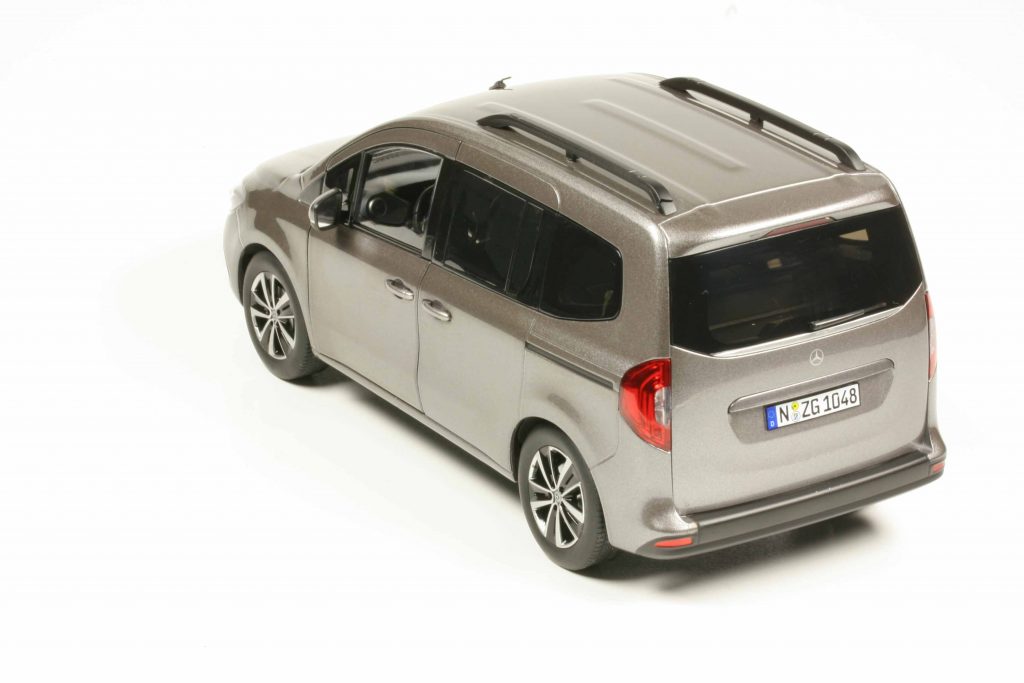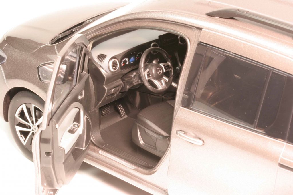 Die Ausstattungsversion heißt Progressive und markiert das T-Klasse-Toplevel für rund 30.000 Euro. Es beinhaltet das Progressive Line Exterieur und Interieur, LED-Scheinwerfer, Nebelscheinwerfer in LED-Technik, Kühlergrill verchromt, verchromte Zierleiste an der Heckklappe, Außenspiegelgehäuse in Wagenfarbe. Der hintere Zugang erfolgt über eine oben angeschlagene Klappe, alternativ gäbe es auch eine zweiflügelige, rechts und links angeschlagene Hecktüre (wie beim Citan). Als Extra trägt die T-Klasse eine Dachreling und den Metalliclack; die 17-Zoll-Aluräder im 5-Doppelspeichen-Design gehören zur Ausstattungslinie Progressive. Das alles hat NZG sehr schön wiedergegeben, die Felgen zweifarbig silbern/glanzschwarz lackiert, dahinter Scheibe und Sattel, auch der Grill ist gesilbert. Im Original sind die Felgen glanzgedreht und der Grill verchromt, doch das Modell weist nirgends Chrom auf. Auch der Stern auf der Heckklappe ist lediglich ein silberner Druck. Teppichboden? Beim Original schon, beim Modell nicht. Man sieht, bei der Konstruktion gab sich NZG die notwendige und von Daimler-Benz vorgeschriebene Mühe und schuf ein schönes Modell. Aber im Detail wurde gespart, um den Verkaufspreis auf jenem Level zu halten, von dem man denkt, der Kunde zahle ihn. Es handelt sich also in der Ausstattung um ein Budget-Modell, die Konstruktion hingegen ist NZG-typisch.
