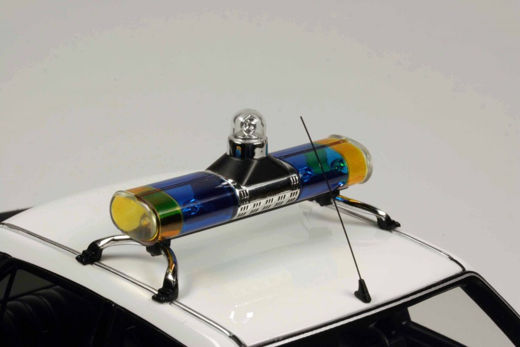 Heute existiert kein Original mehr, aber es gibt einen Nachbau im Museum der APP (Amicale Police Patrimoine), dem französischen Streifenwagenmuseum. Und es gibt 999 Otto-Mobile, hervorragend getroffene Miniaturen, wie üblich, mit Zellonscheiben, wie üblich. Der Blaulichtbalken ist eine Wucht, der Mittelteil mit den Sirenen verchromt, flankiert vom blau- und gelbtransparenten Teil rechts und links, der jeweils Einblick in sein Inneres gewährt: Da sind die im Original schwenkbaren Hochleistungsscheinwerfer zu sehen. Ottomobile gab sich nicht mit dem Dachaufbau und der spezifischen Police-Dekoration zufrieden. Auch wenn der rundum schwarze Innenraum wenig Einblicke zulässt, so ist doch die spezielle Polizeiausstattung zu erkennen, ein Funkgerät mit Hörer.