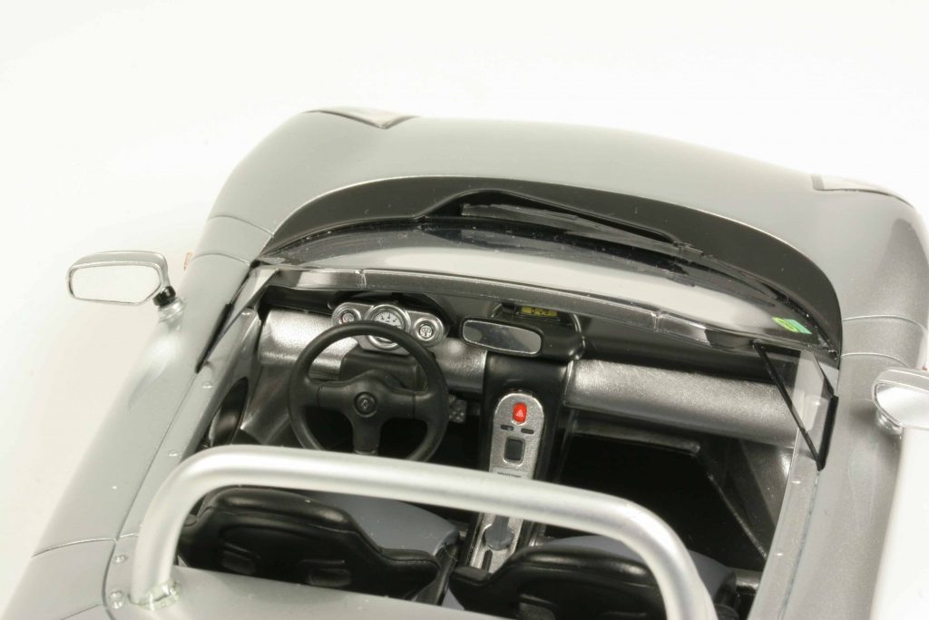 Das offizielle und zeitgenössische Renault-Industriemodell in 1:43 schuf Vitesse, später steuerte Norev seiner 43er-Linie einen Spider bei, ein Billigmodell gab es von Universal Hobbies für die Del-Prado-Partworkserie und von Provence Moulage gab es einen sehr guten Resine-Kit. Einen eher mediokren Spider in 1:18 machte Anson aus Zinkdruckguss. Die Ottomobile-Neuheit ist keine Formneuheit, sondern eine Farbvariante. Vor genau zehn Jahren erschein der Sport Spider erstmals in Sport Yellow 535 mit Grau 630 in 1500er-Auflage, dann folgte Ende 2018 die erste Farbvariante in Sport Blue 250 mit Grau 630, ebenfalls 1500 Stück. Nun neu ist die dritte Version in einfarbigem Titangraumetallic 647 in 999 Exemplaren (jetzt fehlt von den vier Serienfarben nur noch Sport Red 273). Bei allen Unilackierten ist die Heckpartie in Fjord Grey 630 lackiert, einfarbig ist nur der Silberne. Ein rundweg schön gemachtes Modell mit Scheinwerfern hinter Plexiglasabdeckungen, super nachgebildeten Felgen (von der Alpine A610 mit Michelin R16 Pilot SX-Reifen, die Flanken von Ottomobile leider nicht beschriftet). Faszinierend ist der Innenraum ob seiner Kargheit. Da ist nahezu nichts drin, aber dies ist sehr linear angeordnet und aufgeräumt. Selbst ein Ford Model T dürfte mehr Schalter am Armaturenbrett haben als der Renault Sport Spider. Der hat nämlich gar keine! Das bisschen, was es zu bedienen gibt, konzentriert sich auf die Konsole, ansonsten mehr Purismus als im Wohnbereich von Diogenes von Sinope, der bekanntlich in einem leeren Fass lebte.