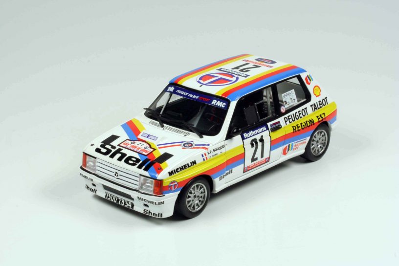 Schön ist die Dekoration, wie üblich mit Klarlack versiegelte Decals. Die Grundfarbe ist weiß, die Streifen sind in den Peugeot-Talbot-Motorsportfarben blau-rot-gelb gehalten, ein großes Talbot-Logo auf dem Dach, und Jean-Paul Bouquet konnte einige Sponsoren an Bord holen: zunächst Peugeot-Talbot Région Est (also das Vertriebsgebiet im Osten des Landes), Shell, Michelin, Rothmans – somit also alle üblichen Verdächtigen, die wir als Sponsoren auf 80er-Jahre-Rallyeautos mögen. Sehr hübsch und sogar leserlich von Ottomobile umgesetzt ist die typisch französische Eigenheit, eine Art „Ausweis“ des Fahrers und Beifahrers am hinteren Seitenfenster zu befestigen, inklusive Passfoto der beiden, worauf die „technischen Daten“ der Fahrer zu sehen sind. Auf Zusatzscheinwerfer, ja sogar auf Nebellampen, musste Monsieur Bouquet offenkundig verzichten. Hätte er bei einer Sponsorensuche auch Cibié kontaktiert, so hätten die ihm bestimmt einen Christbaum vor dem Kühlergrill spendiert. Statt dessen sehen wir das hübsch verchromte Talbot-„T“ im Grill. Auf das Dach gehört eine Antenne zur Selbstmontage, wir haben sie nicht montiert.