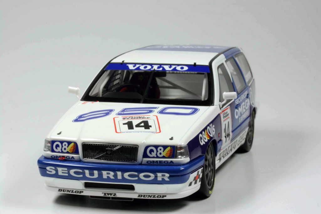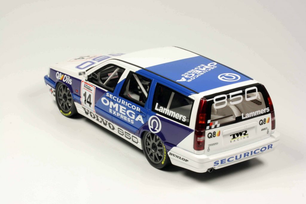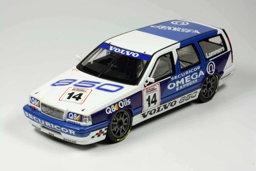 Rennwagen rennen. Coupés auch. Auch Limousinen können rennen. Aber Kombis? Eigentlich nicht. Kombis schuften, aber rennen nicht. Und doch… Ein Rennwagen soll schnell sein. Aerodynamik hilft. Der Luftwiderstandsbeiwert ist bei Kombis oftmals besser als bei Limousinen, der Abrisskante wegen. Eigentlich spricht nichts gegen den Rennkombi, zumal er auch nicht schwerer ist als die Rennlimousine. Und er macht etwas her! Er ist der Liebling des Publikums. Und natürlich der Medien. Dennoch ist und bleibt der Rennkombi selten. Volvo setzte einen ein, 1994 bei der Britischen Tourenwagenmeisterschaft BTCC. Man spricht noch heute darüber, denn dies war eine äußerst originelle Idee. Es gab auch etliche Miniaturautos, quer durch die Maßstäbe. Selbst 1:87 wurde bedient, seinerzeit durch ein Wiking-Industriemodell für Volvo, in 1:43 von Minichamps und HPI-Racing, selbst in 1:64 gibt es ihn, von Tarmac Works, dazu einen 1:25-Plastikkit von Tamiya. Nun in 1:18, ein Resinemodell von Ottomobile. Ebenso wie das Original, ist das Modell originell – im positivsten Sinne des Wortes.